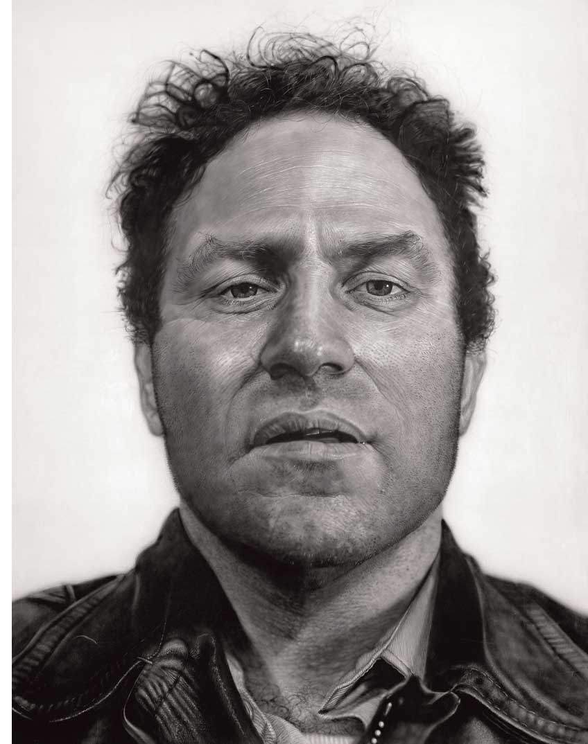 바로 여권 사진처럼 얼굴만 찍은 사진이다. 좀 더 강력한 인상을 주기 위해 꾸미거나 부풀리지 않은, 그야말로 중립적인 사진. 그래서 그는 머그샷(mug shot)과 같은 얼굴만이 정직하게 나온 흑백사진을 찍어서 그렸다.