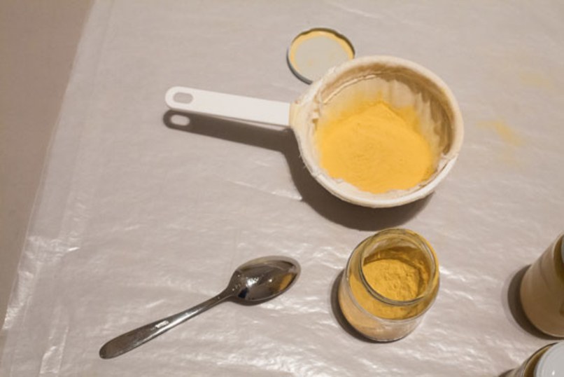 이렇게 자연에서 꽃가루를 모으는 순간부터가 작품이다. 즉, 꽃가루를 모으는 과정이 작품인 셈이다. 그리고 또한 이렇게 모은 꽃가루를 바닥에 펼쳐내는 작업 역시 작품에 속한다. 포털 사이트에 <헤이즐넛에서 온 꽃가루>를 검색하면 달랑 작품만 찍은 사진보다는 대부분 그가 작품 작업에 몰두해 있는 것이 많다. 이는 작품이 완성된 최종 모습보다는 완성되어가는 과정이 그만큼 중요하다는 것을 의미한다.