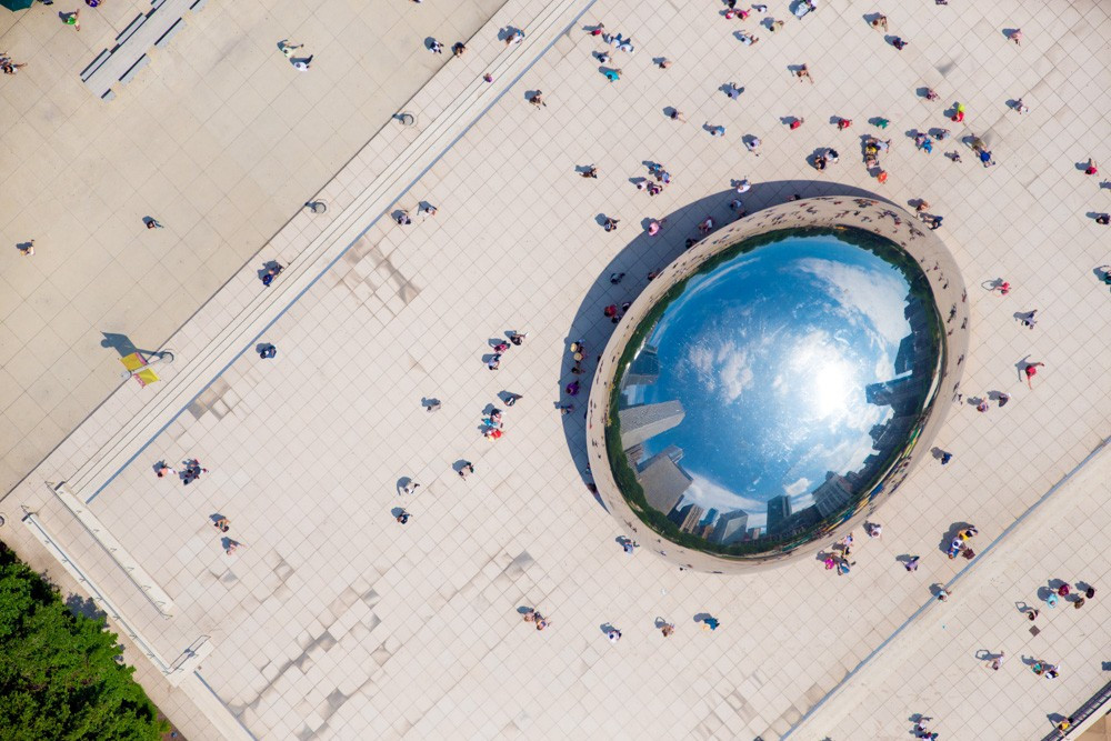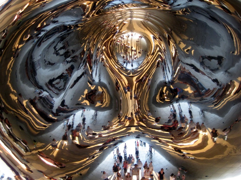 그리고 그 모양은 별명에 걸맞게 멀리서 보면 거대한 콩 모양이다. 이렇게 멋진 작품과 함께 자신을 사진에 담는 일은 즐겁다. 그리고 또 하나의 재미는 셀카 한 장으로도 그 주변을 모두 담아낼 수 있다는 점이다. 콩 모양의 매끄러운 스테인리스 표면은 이음새가 없어 마치 거대한 거울처럼 외부를 반사시킨다. 그래서 그 주변을 모두 표면에 담아낸다. 셀카를 찍지만 그곳에 있는 모든 관광객과도 함께 사진을 찍을 수 있다. 그리고 동시에 시카고의 멋진 스카이 라인도 한 번에 담아낼 수 있다. 클라우드 게이트가 외부 표면의 3/4 정도는 하늘을 반영하기 때문이다.