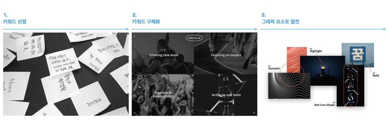 아무래도 실무자들은 클라이언트 사장님들보다 평소에 다양한 레퍼런스를 많이 보고 학습했기 때문에 더 좋은 아이디어와 방향으로 제안할 수 있다. 이 과정에서 사장님과 실무자는 많은 논의와 고민 끝에 최종적으로 함께 합의한 키워드와 무드 보드를 도출한다. 그리고 누구나 브랜드에 대해 쉽게 이해할 수 있도록 한 줄 소개, 한 문장으로 소개, 영문/한글 슬로건 등 간결하고 임팩트 있게 정리하는 과정도 중요하다.