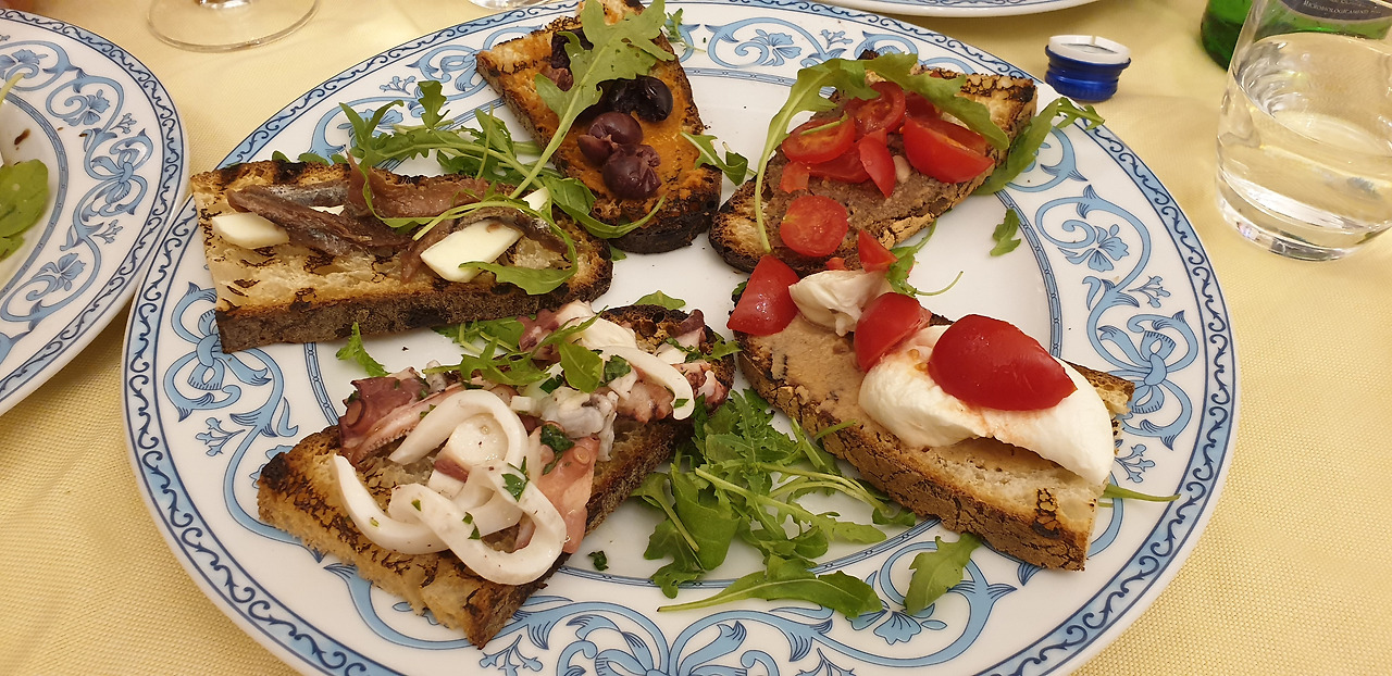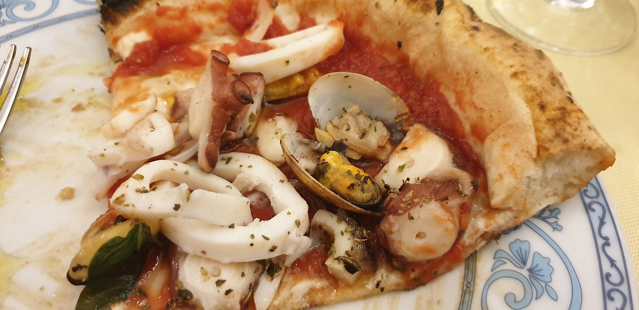 그곳을 자나 이번 여행의 마지막 만찬 장소인 소박한 식당을 향했다. 여행 중 음식 사진을 찍지 않았지만, 나폴리 식당에서 먹은 요리는 특별해서 사진으로 남겨두었다. 맛집들은 대부분 메뉴 판에 음식 사진이 없었다. 글로 제공되는 메뉴판의 음식을 고르는 것은 복불복 게임 같았다. 먹을 수 있는 것을 고르느냐 아니냐는 우리의 몫이였다. 우리가 고른 것은 모차렐라에 계란 물을 입힌 튀김, 문어, 오징어, 홍합이 올라간 피자, 다양한 해물이 올라간 브루스케타, 치즈가 사이사이 들어간 토마토 카프레제였다. 음식은 모두 신선한 재료를 사용한 것 같았다. 이태리 여행 중, 음식은 또 하나의 즐거움이었다.