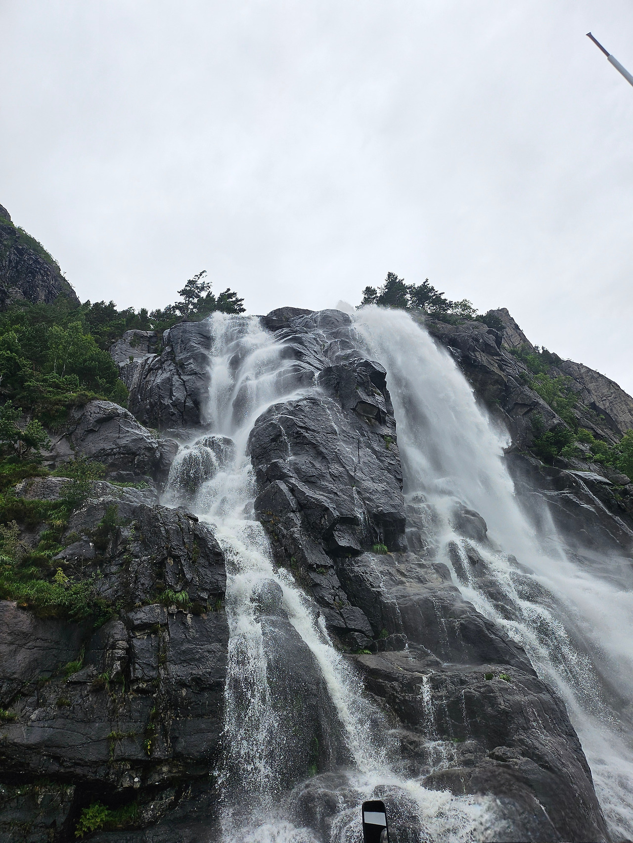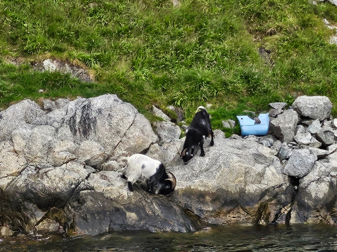 보트가 점점 깊숙이 들어서자, 절벽 위에서 풀을 뜯는 야생 염소 무리가 눈에 들어왔다. 믿기 어려울 만큼 높은 곳에서 여유롭게 풀을 뜯는 모습은 동화 속 장면처럼 보였다. 가이드의 설명에 따르면, 이 염소들은 계절마다 절벽을 오르내리며 살아간다고 한다. 배가 가까이 다가가자 배 쪽으로 걸어 내려와 가이드가 주는 우유를 받아먹는다. 아마도 관광객들에게 염소를 더 보여주려는 보트 투어의 퍼포먼스였을 것이다. 덕분에 나도 노르웨이 염소 사진을 찍었다. 사람의 손이 닿지 않는 자연 속에서 사는 염소가 사람의 손길을 거부하지 않는 모순 같은 상황이었다.