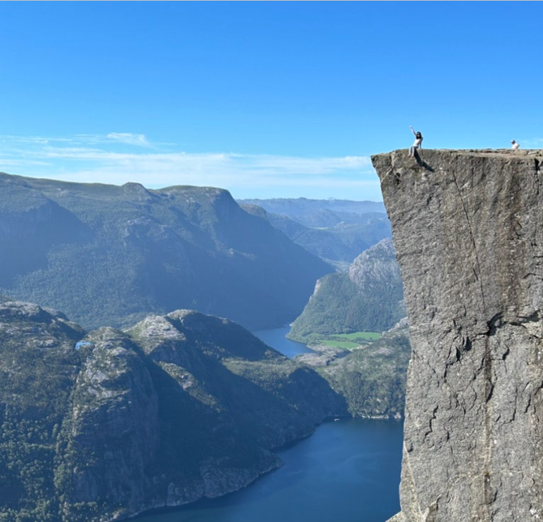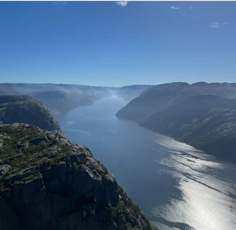 우리는 작은 보트들이 모여 있는 선착장으로 갔다. 뤼세피오르드(Lysefjord)와 프레이케스톨렌(Preikestolen)을 감상하는 코스였다. 스타방에르 항구에서 출발한 보트는 잔잔한 바다를 가르며 피오르드 안으로 천천히 들어섰다. 금문교를 본떠 만든 듯한 긴 다리와 양 떼 목장 양들은 그림같이 펼쳐져 있었다. 배는 양쪽으로 솟아오른 깎아지른 듯한 수직 절벽 사이에서 잠시 멈췄다. 604m 높이의 절벽은 프레이케스톨렌 일명 '설교단‘ 이름은 바위의 형상이 설교단처럼 생겼다 하여 붙은 이름이라고 가이드가 설명했다. 하이킹하는 이들이 중간 기점에서 내렸다. 그들은 아마 이 피오르드를 아래에서 내려다볼 수 있는 경험을 할 것이다.