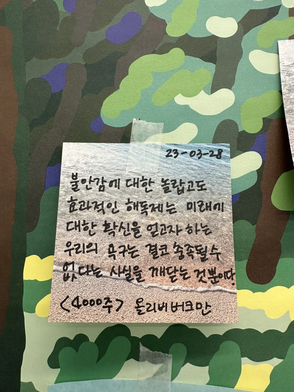 집에 가만히 있을 걸 괜히 병원에 다녀와서 더 불안해졌다. 이렇게 불안한 이유는 오늘 들은 말 때문만은 아니다. 2주 전에 한 양수검사(임신부의 복부를 통해 바늘을 넣어 양수를 채취하여 태아의 염색체 분석을 하는 검사) 때문이다. 결과가 앞으로도 일주일이나 더 있어야 나오는데 초조해서 아무것도 할 수가 없다. 염색체 이상이 나오면 어쩌지? 지난번 유산처럼 또 낳아야 한다면 그 슬픔에서 회복할 수 있을까? 또다시 내 산도를 빠져나오는 그 느낌을 내가 과연 감당할 수 있을까? 도저히 받아 낼 수 없는 걱정이 쏟아져서 어떤 마음으로 숨을 쉬어야 할지도 모르겠다. 그러다 뭐라도 살 방법을 찾아보겠다 싶어 에버노트 앱을 켜고 ‘불안’이라고 쳤다. 내가 저장해 둔 문장 중 나를 구해줄 뭔가 있지 않을까 희망을 가지고 오랫동안 스크롤바를 내렸다. 한 문장이 눈에 덜컹 부딪쳤다. 그리고 받아 적었다.