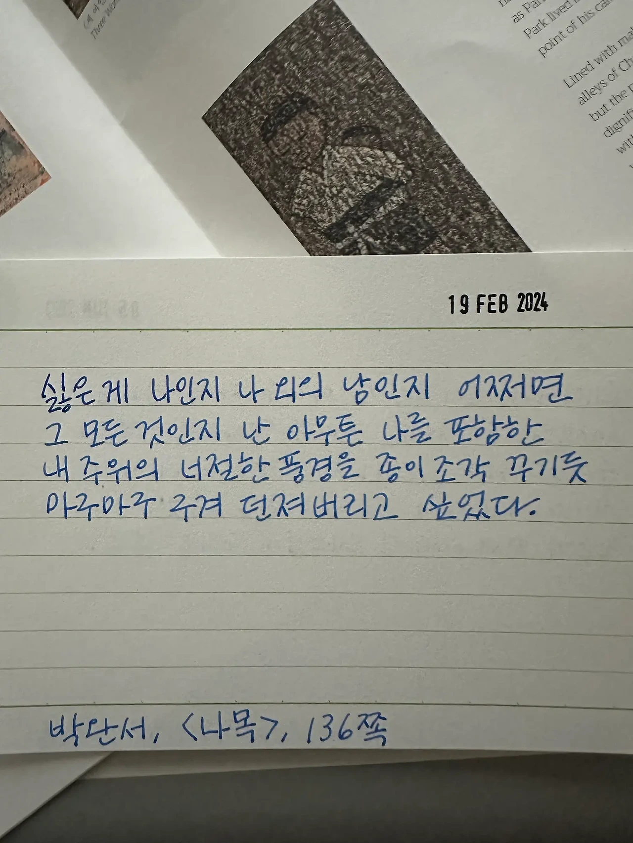 싫은 게 나인지 나 외의 남인지 어쩌면 그 모든 것인지 난 아무튼 나를 포함한 주위의 너절한 풍경을 종이 조각 꾸기듯 마구마구 구겨 던져버리고 싶었다.