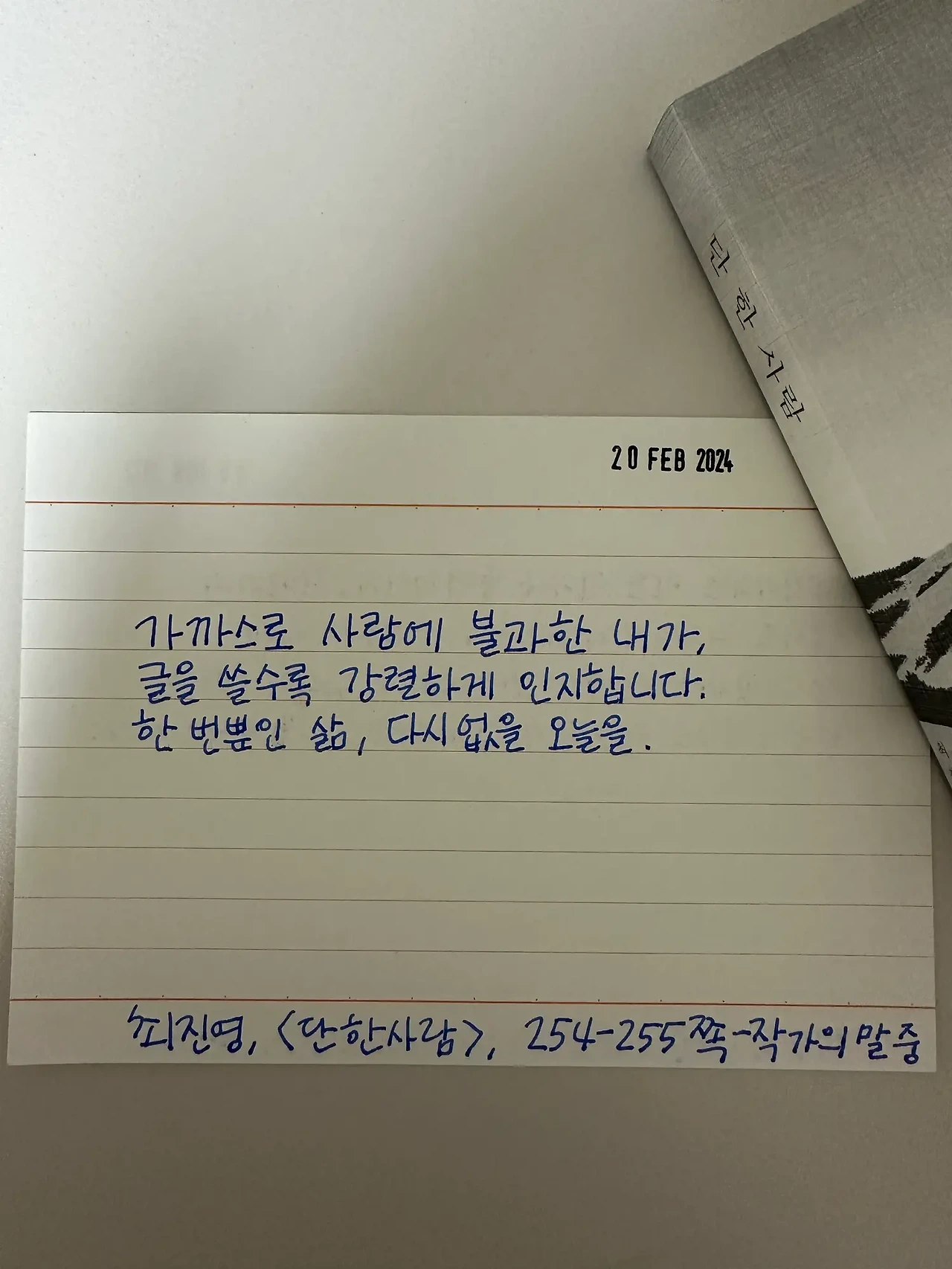 가까스로 사람에 불과한 내가, 글을 쓸 수록 강렬하게 인지합니다. 한 번뿐인 삶, 다시없을 오늘.