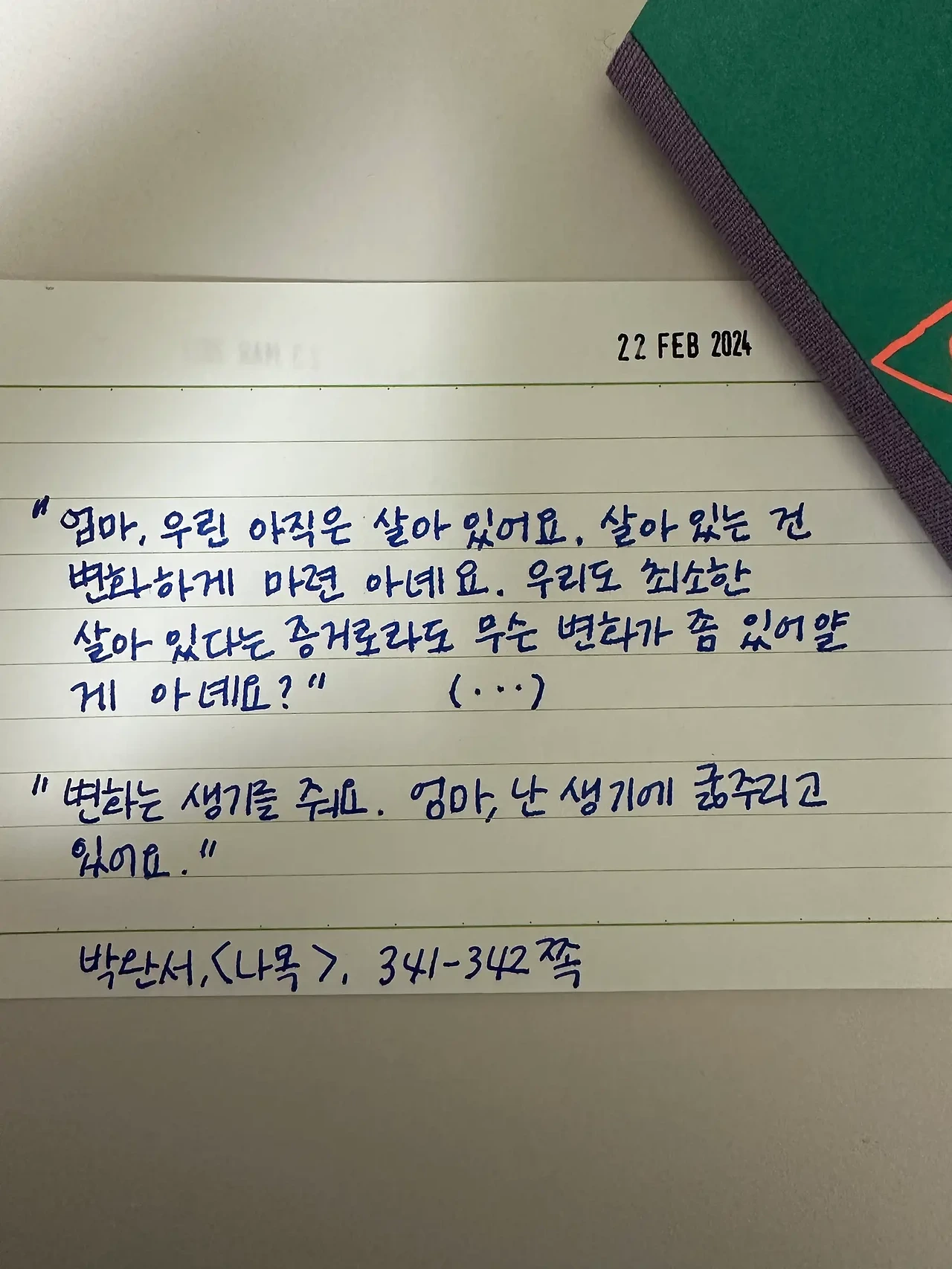 한국 전쟁이 발발하던 해 20살이 되는 건 비극이라고 생각하겠지만, 그때도 연애도 하고 설빔도 입고 만두도 빚어 가족들과 나눠 먹는 장면이 인상적이었다. 당시 상황을 자세히 묘사해 줘서 꼭 우리 할머니가 겪은 일을 아랫목에 앉아 듣는 것 같았다. 게다가 외할머니는 31년 생으로 박완서 작가님과 동갑이다. 그래서인지 더 우리 할머니가 직접 겪은 일 같았다.