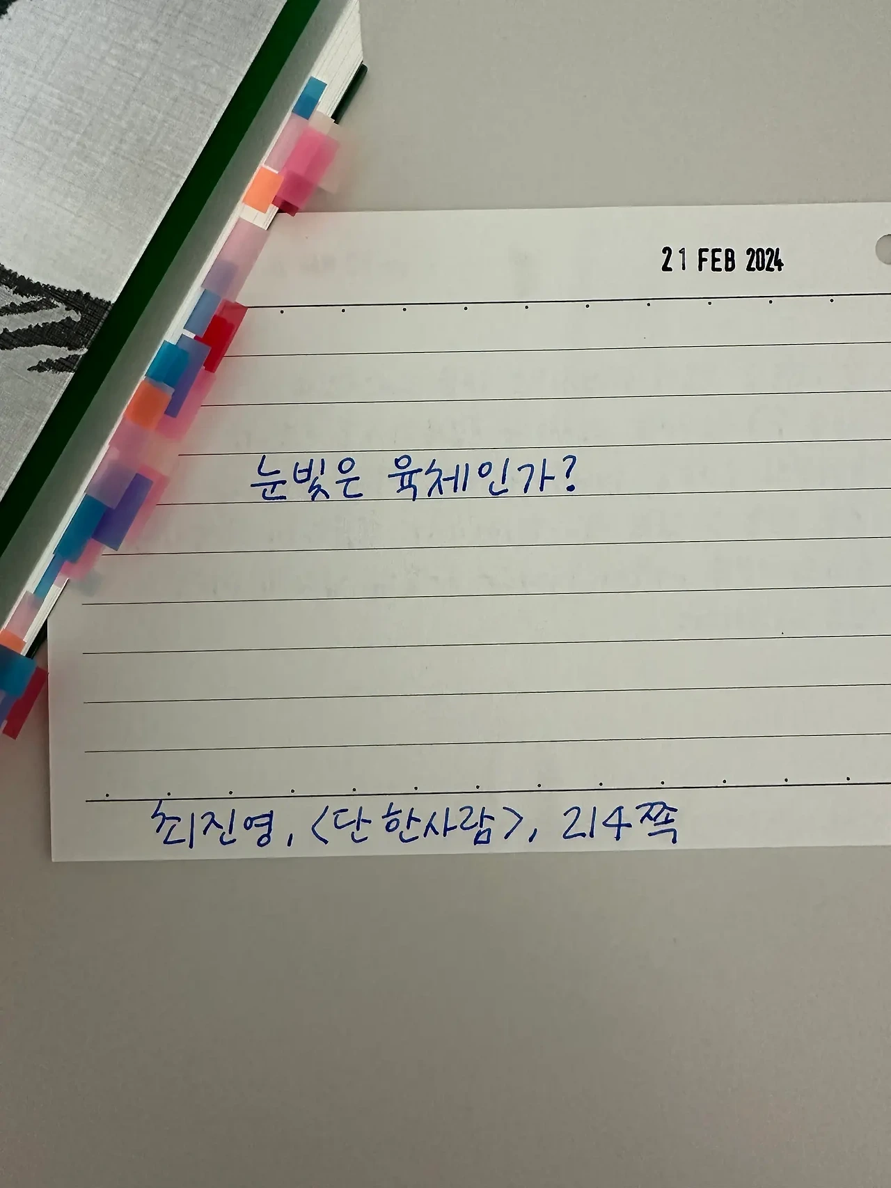 이분법으로 판단하는 사고를 버리고 싶어요. 좋다-나쁘다, 내 편-네 편, 안-밖 이렇게 유치하게 생각하는 것이요. 대충 생각하고 빨리 다음으로 넘어가고 싶은 나태한 자의 사고방식이겠죠. 그런 저에게 이 질문을 던지고 싶어요. 눈빛은 육체인가?