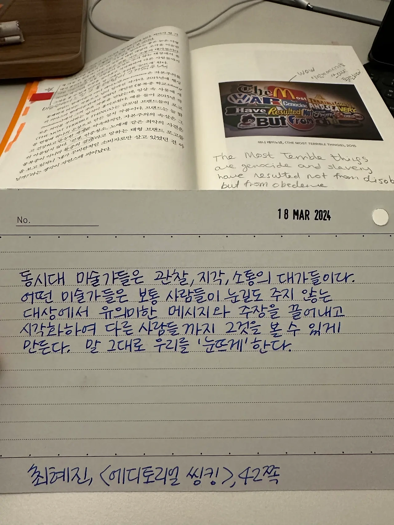 현대 미술관에서 느끼는 그 강렬함의 정체를 몰랐습니다. 다녀오면 책을 10권 이상 읽은 듯 적을 것이 많았고, 메시지들마다의 인상도 깊어 오래 생각하곤 했거든요. 최혜진 작가님의 이 문장을 보고 비로소 알게 되네요. 유의미한 메시지를 볼 수 있게 눈뜨게 해 준 거네요. 요즘 생각의 재료 수집을 책으로만 하고 있어서 나태하다고 머리를 쥐어 박고 있었는데요. ’눈뜨러‘ 더 성실하게 미술관에 가야겠다고 다짐해 봅니다.