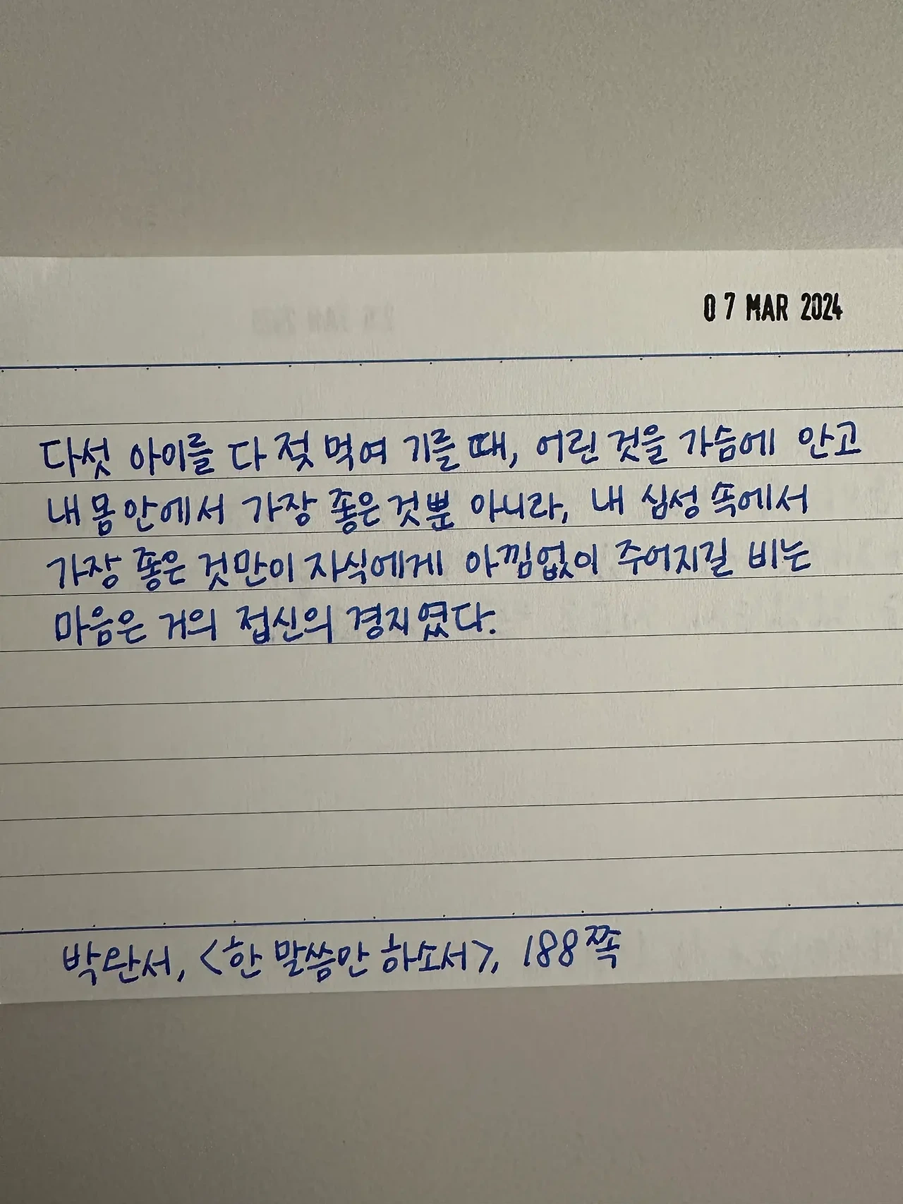 다섯 아이를 다 젖 먹여 기를 때, 어린 것을 가슴에 안고 내 몸 안에서 가장 좋은 것 뿐 아니라, 내 심성 속에서 가장 좋은 것 만이 자식에게 아낌없이 주어지길 비는 마음은 거의 접신의 경지였다.