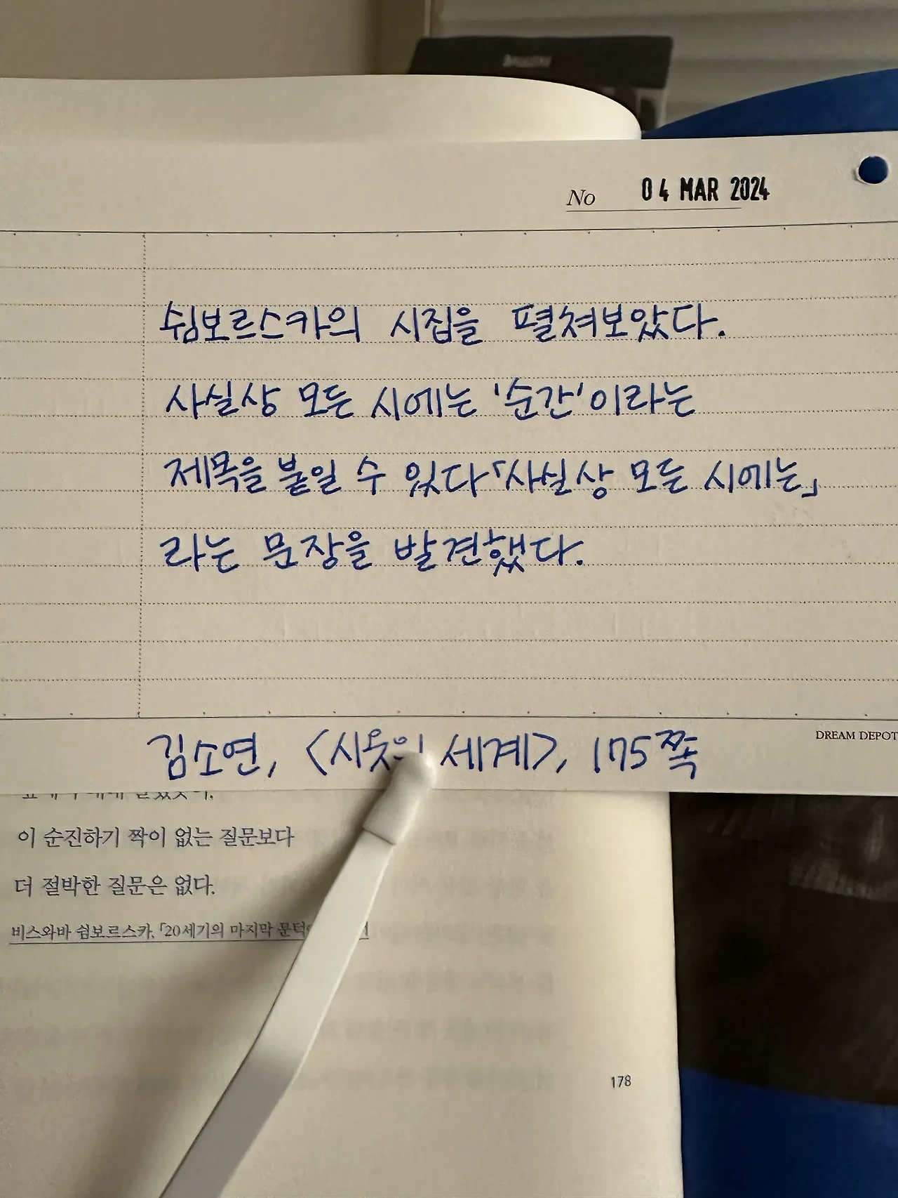 쉼보르스카의 시집을 펼쳐보았다. 사실상 모든 시에는 ‘순간’이라는 제목을 붙일 수 있다 라는 문장을 발견했다.