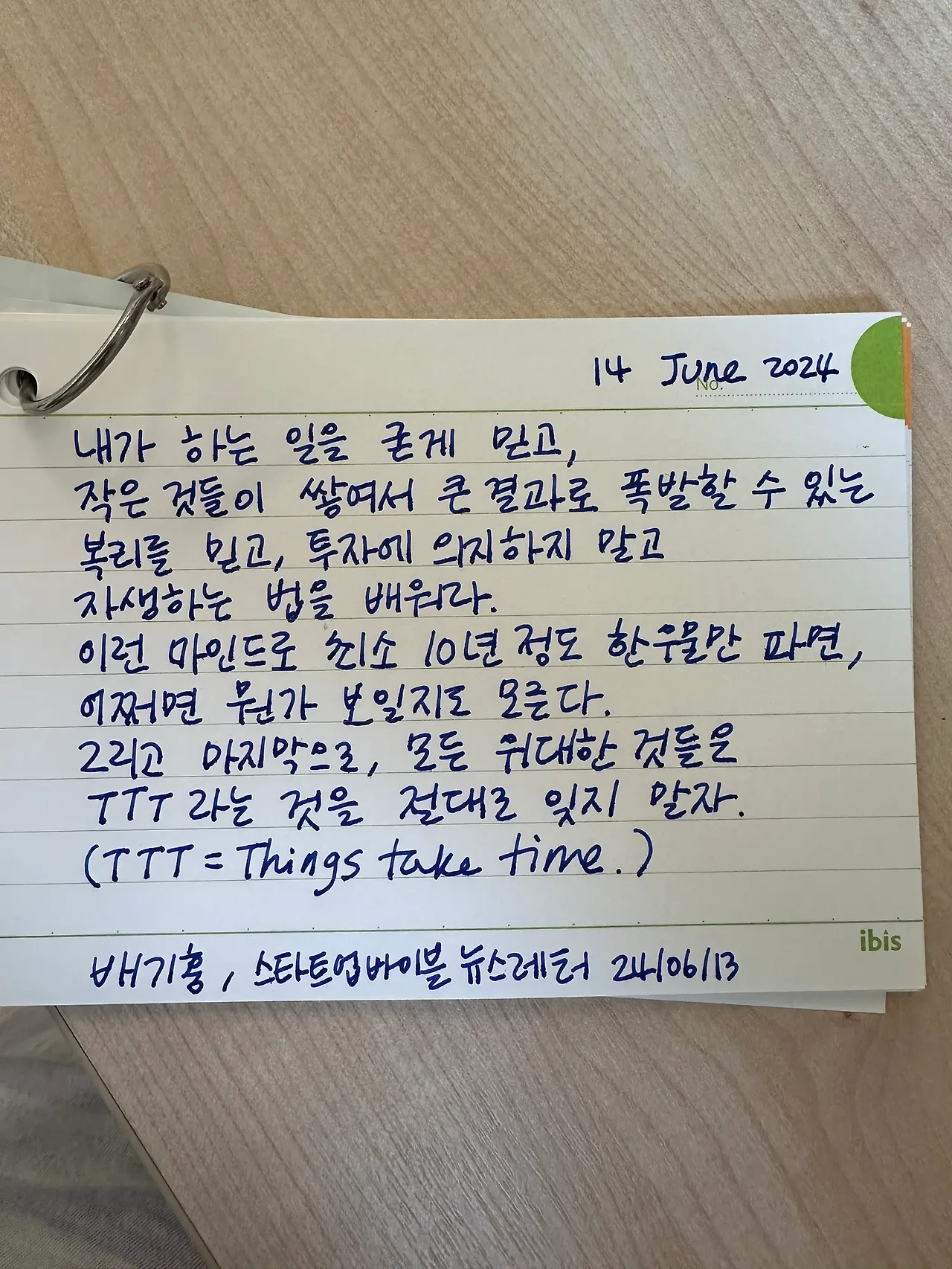 내가 하는 일을 굳게 믿고, 작은 것들이 쌓여서 큰 결과로 폭발할 수 있는 복리를 믿고, 투자에 의지하지 말고 자생하는 법을 배워라. 이런 마인드로 최소 10년 정도 한 우울만 파면, 어쩌면 뭔가 보일지도 모른다. 그리고 마지막으로, 모든 위대한 것들은 TTT라는 것을 절대로 잊지 말자. (TTT=Things Take TIme.)