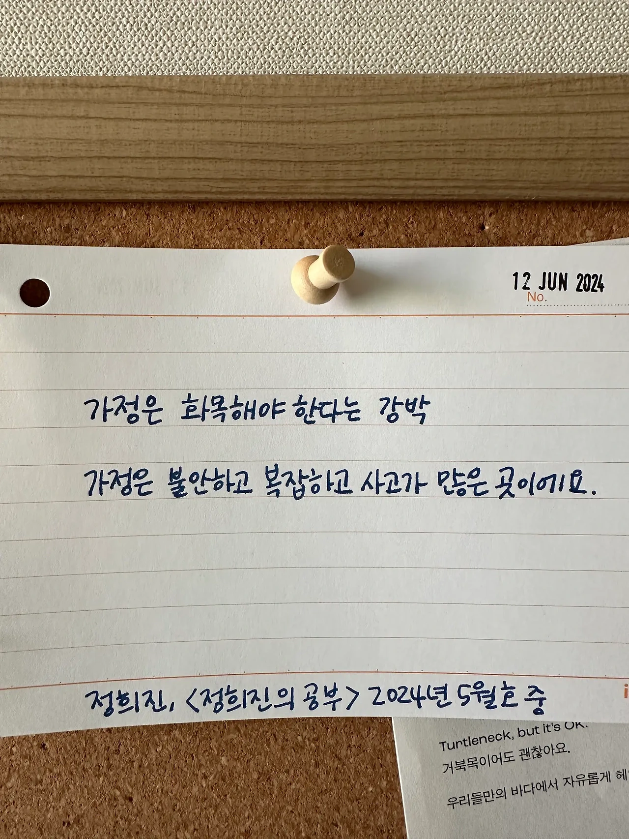 정희진의 공부 팟캐스트를 듣다가 이 부분을 따라 적었어요. 가정은 화목한 곳이라기보다는 불안하고 복잡하고 사고가 많은 곳이 맞는 것 같아요. 그런 곳에서 마음의 평화를 찾았으니, 오류도 보통 오류가 아니었네요. 번지수가 틀렸어요.