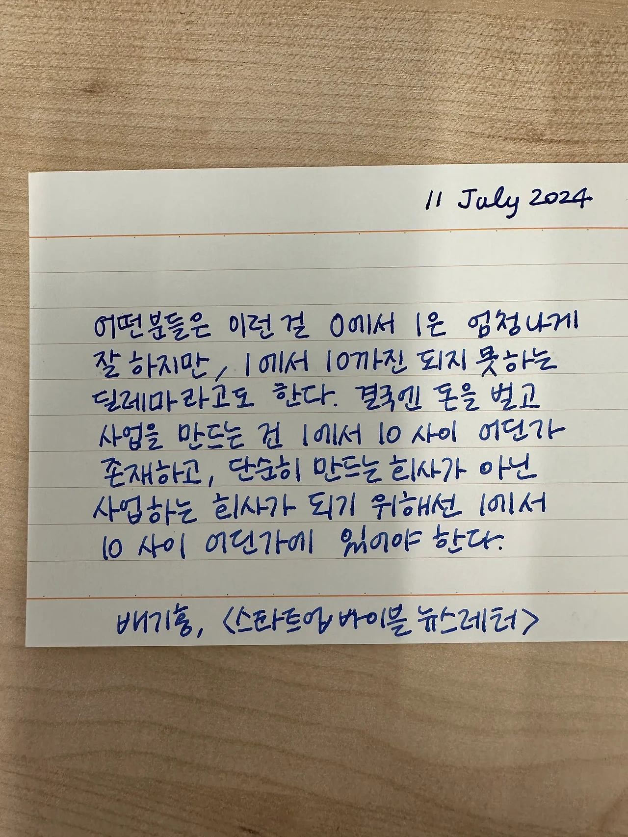 어떤 분들은 이런 걸 0에서 1은 엄청나게 잘 하지만, 1에서 10까진 못 하는 딜레마라고도 한다. 결국엔 돈을 벌고 사업을 만드는 건 1에서 10 사이 어딘가에 존재하고, 단순히 만드는 회사가 아닌 사업하는 회사가 되기 위해선 1에서 10 사이 어딘가에 있어야 한다.