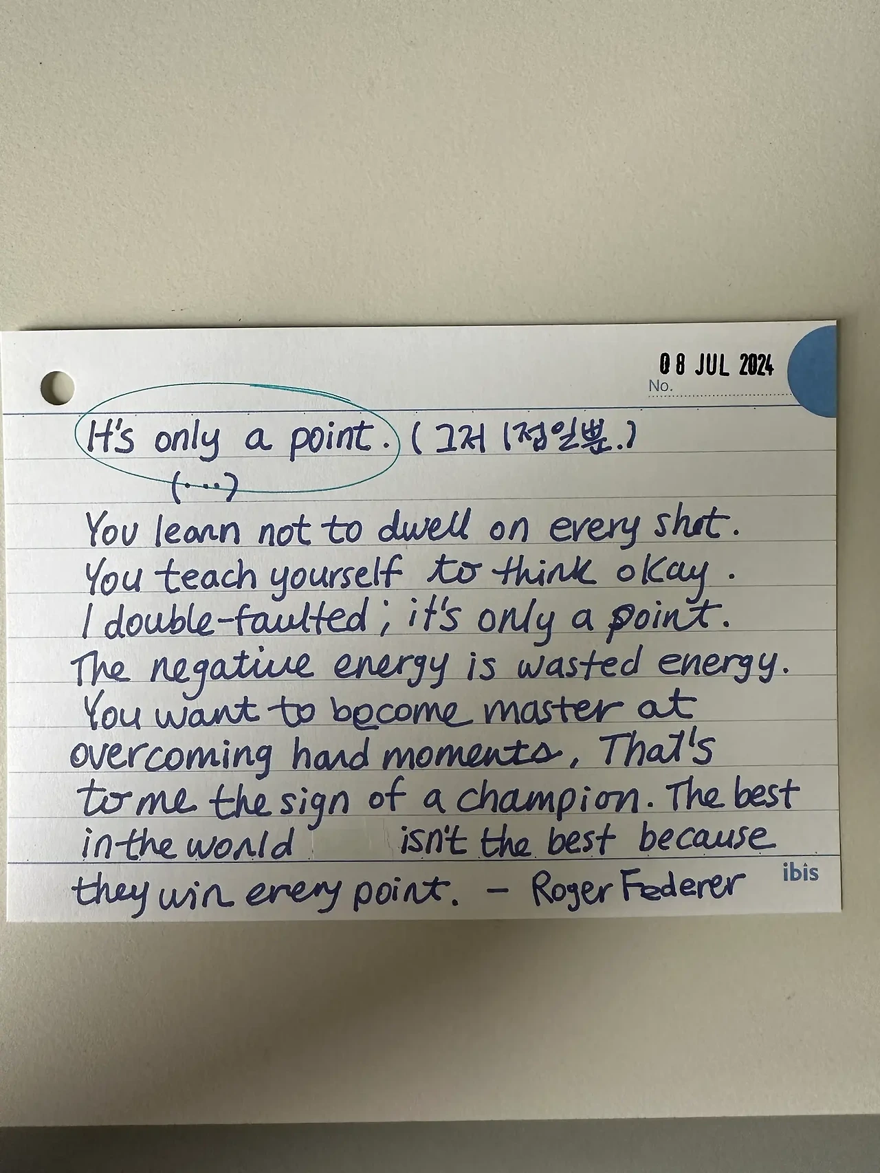 주말에 영상을 보고 이 말이 계속 생각나요. 그냥 1점일 뿐이라는 거. 챔피언들도 모든 포인트를 이기는 게 아니라고. 그러니 망한 거에 대해 계속 생각하지 말라고.