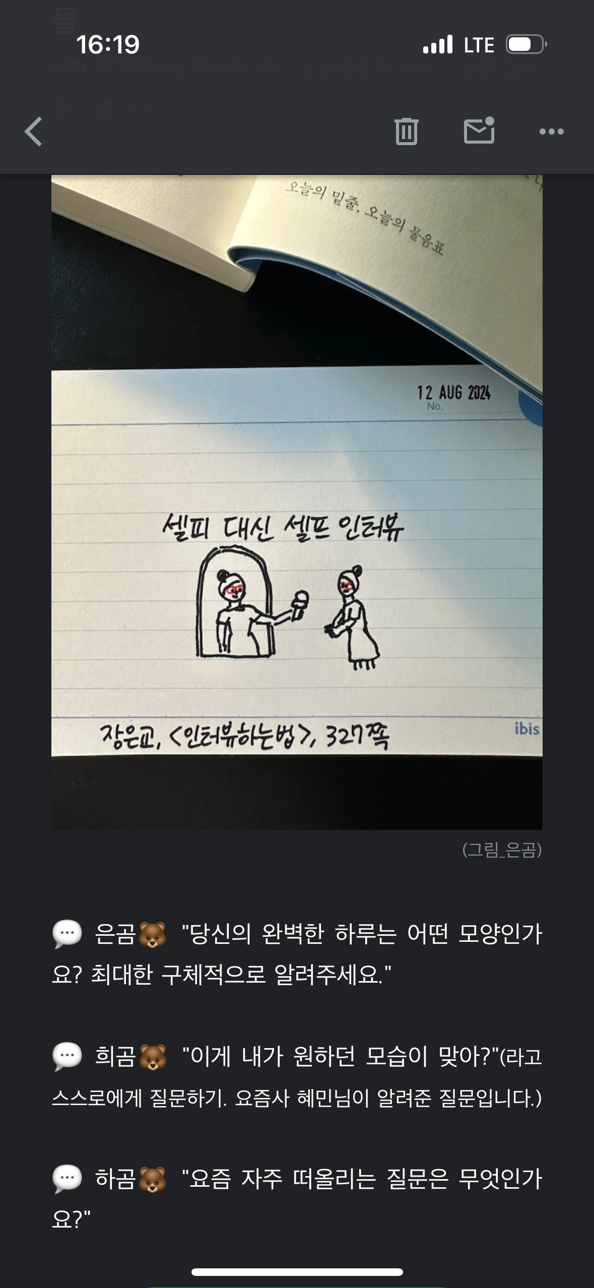 과거의 나에게 영감을 받는 일이 드문데 (과거의 나는 항상 시시하다.) 오늘은 내가 쓴 글씨에서 힌트를 얻었다. 친구들과 발행하고 있는 뉴스레터(오곰장 편지)를 열어 보다가, 이렇게 한번 해볼까, 생각이 확장되었다. 새로 시작하는 인터뷰 프로젝트를 어떻게 해야 하지 고민하고 있었는데, 셀프 인터뷰 방식으로 하면 어떨까, 생각하게 되었다. 차분하게 질문을 준비해 보자.