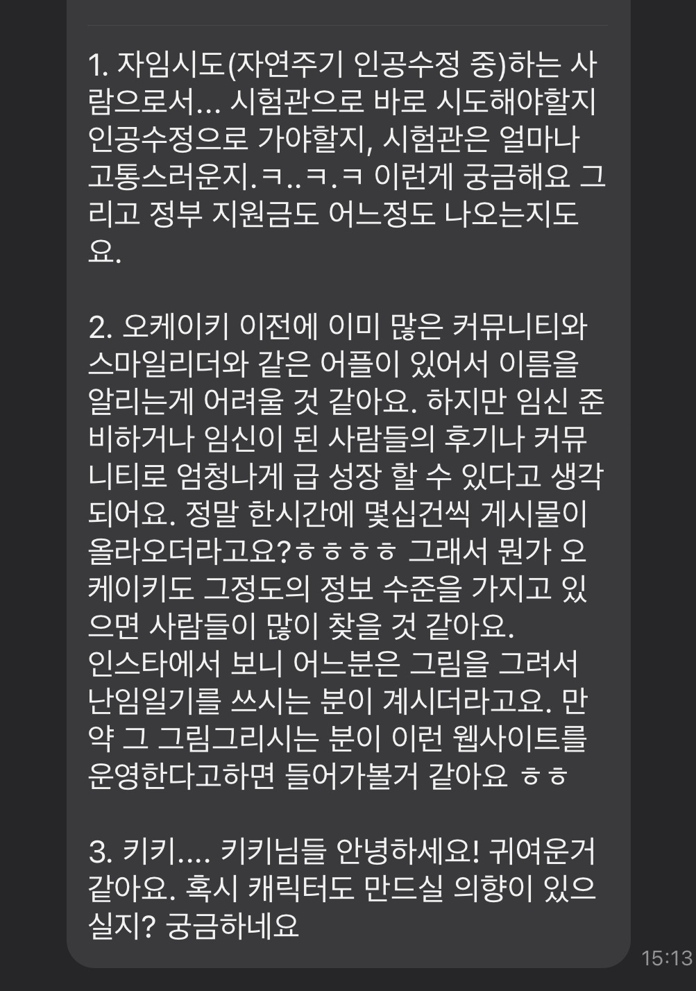 - 자연주기 인공수정 중인 30세 후배의 친구에게 홈페이지 리뷰를 부탁했다가, 큰 도움을 얻었다. (평소에 이런 부탁을 하지 못하는 성격인데, 소하 님이 지금 이것저것 가릴 처지냐고 한 말에 크게 동의하면서 질문을 보냈다.)