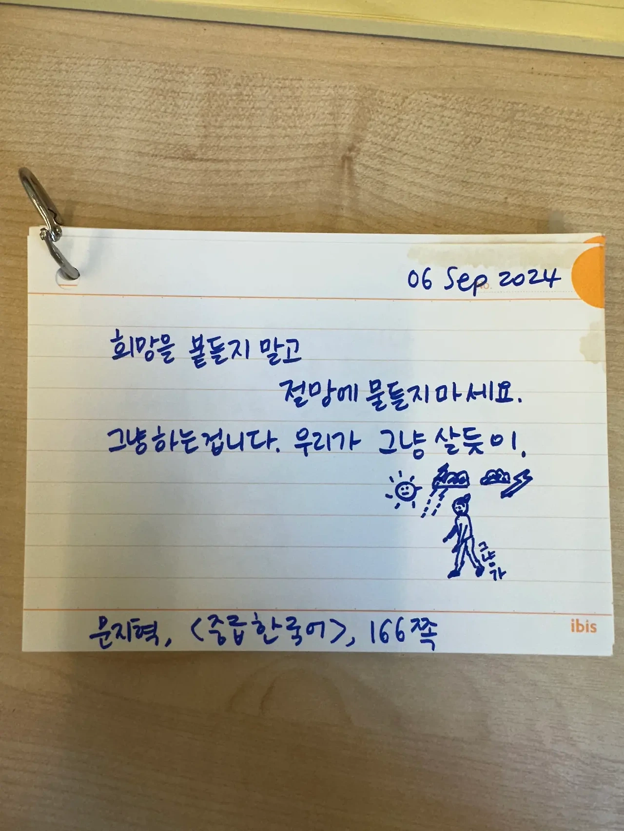 희망을 붙들지 말고 절망에 물들지 마세요. 그냥 하는 겁니다. 우리가 그냥 살듯이.