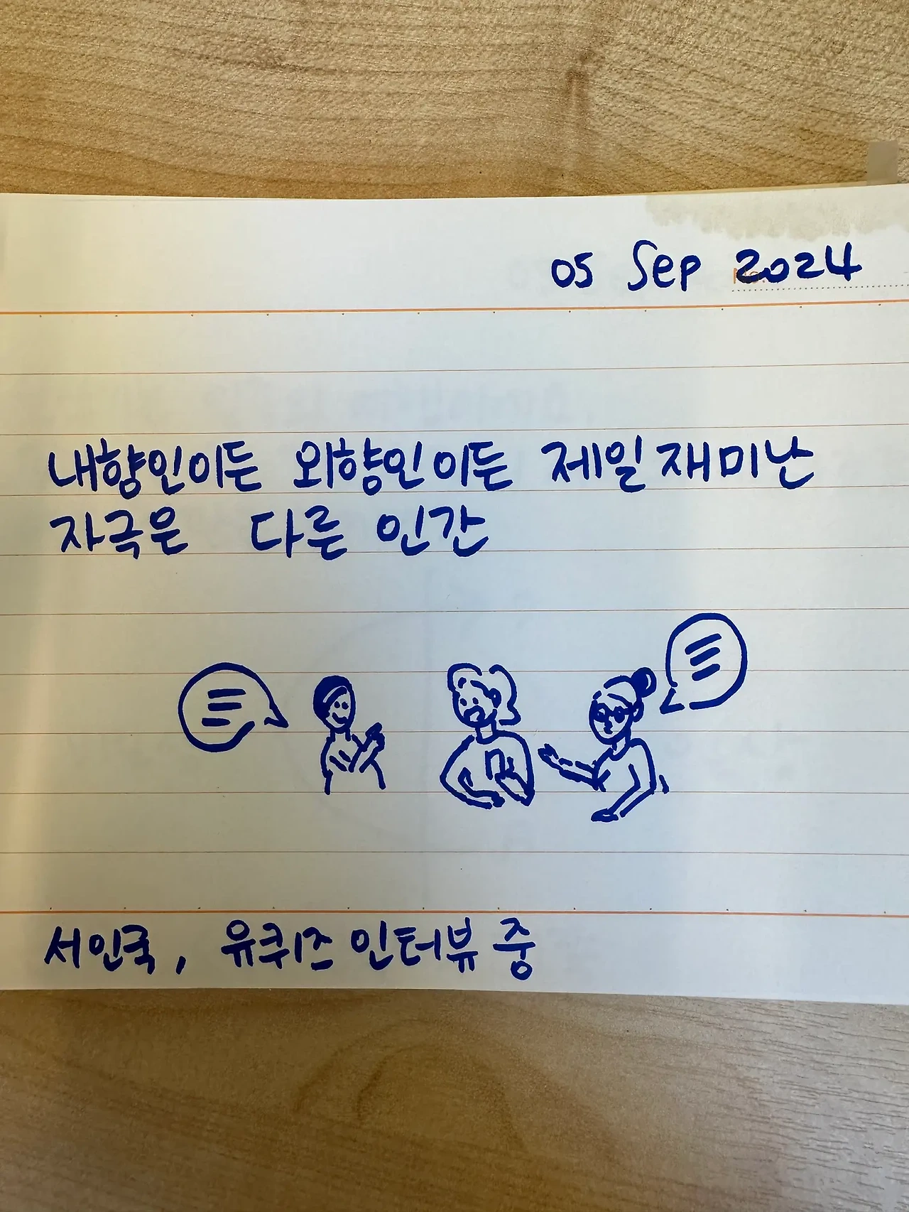 얼마 전 친구가 저를 인터뷰해 주었어요. 그걸 업무에 사용해야 해서 그 친구가 문서로 정리해서 보여줬습니다. 제가 인터뷰이가 되고 그 대화가 문서화된 걸 본 게 처음이었어요. 내가 한 말이 맞는데 다른 사람 말 같기도 하고 더 멋있어 보였어요. (친구의 애정 필터 덕분이겠죠.)