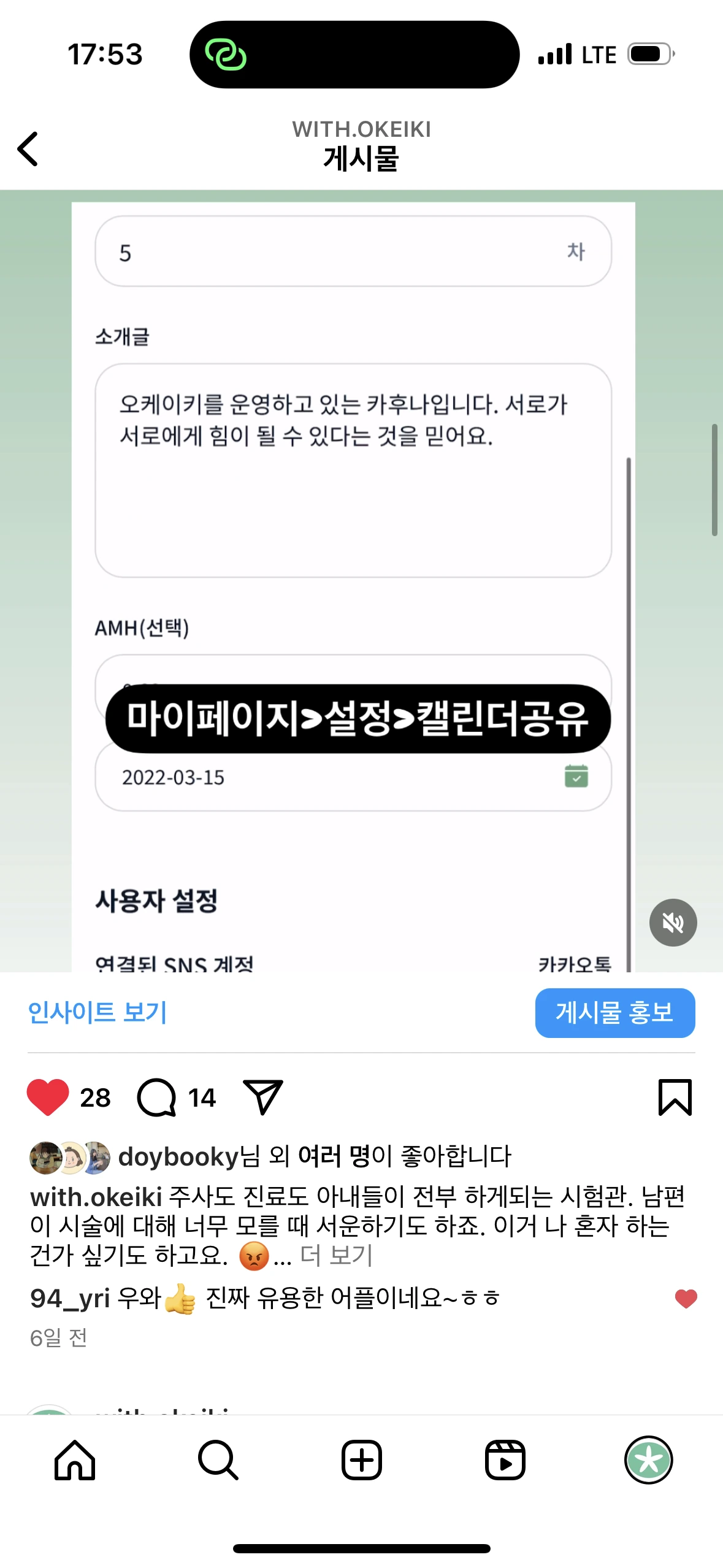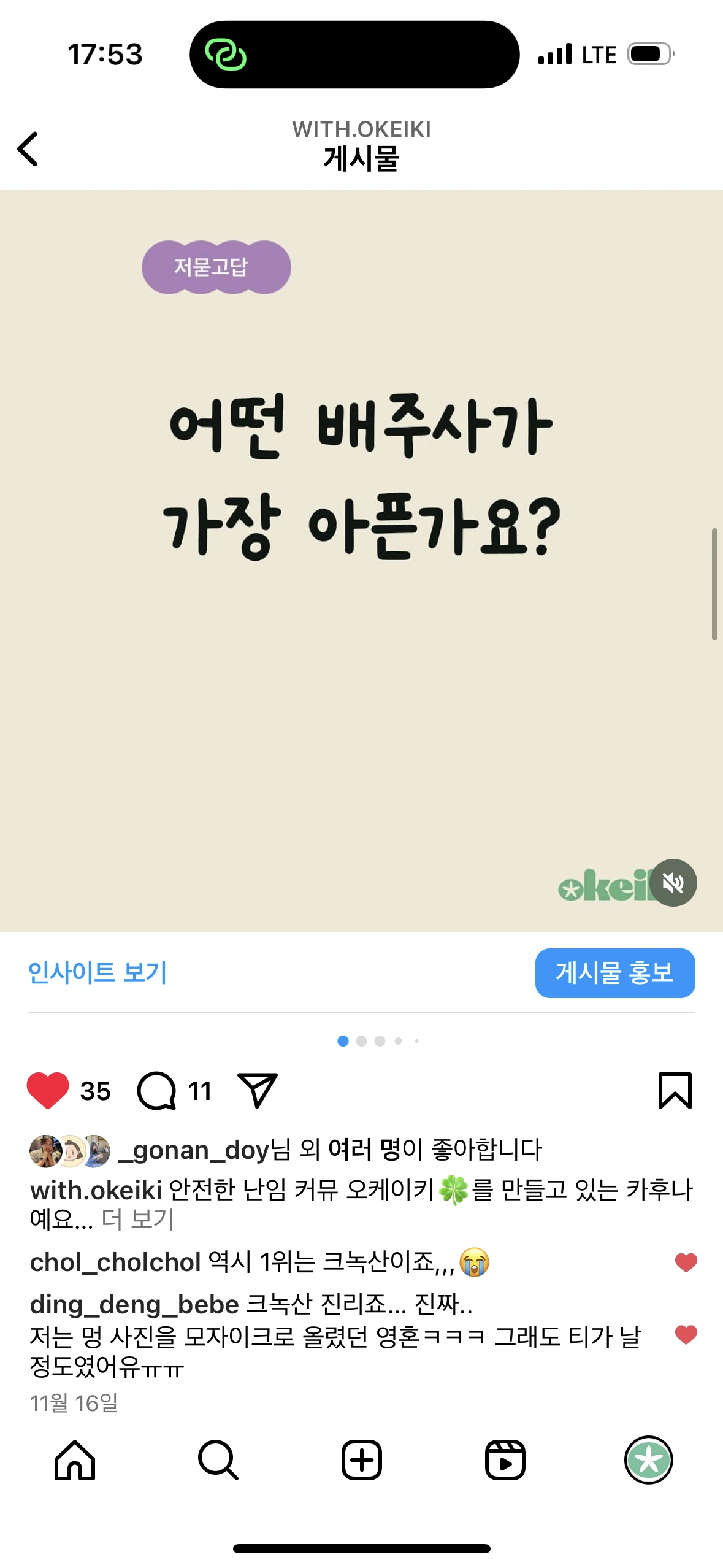 - 인스타그램에서도 꾸준히 오케이키를 홍보 중: 늘 하는 인스타그램 홍보지만 변화가 있었다. 아무도 댓글을 달지 않았는데 이번 주에 올린 글에는 댓글이 10개도 넘게 달렸다. 이제까지는 인스타그램 플랫폼 이해가 떨어졌었다는 걸 알게 되어 몇 가지 배운 것을 적용했는데 그래서 가닿은 것 같다. (배운 것은 간단한데, 첫째는 T적으로 올리지 말고 F적으로 올리자는 것. 최대한 구체적인 상황을 넣었을 때 공감해 주는 분들이 많았다. 둘째는 카드 뉴스 디자인에 디자이너 원님에게 배운 것을 모두 넣은 것인데 - 포인트는 한 페이지에 한 가지만 강조하자는 것)