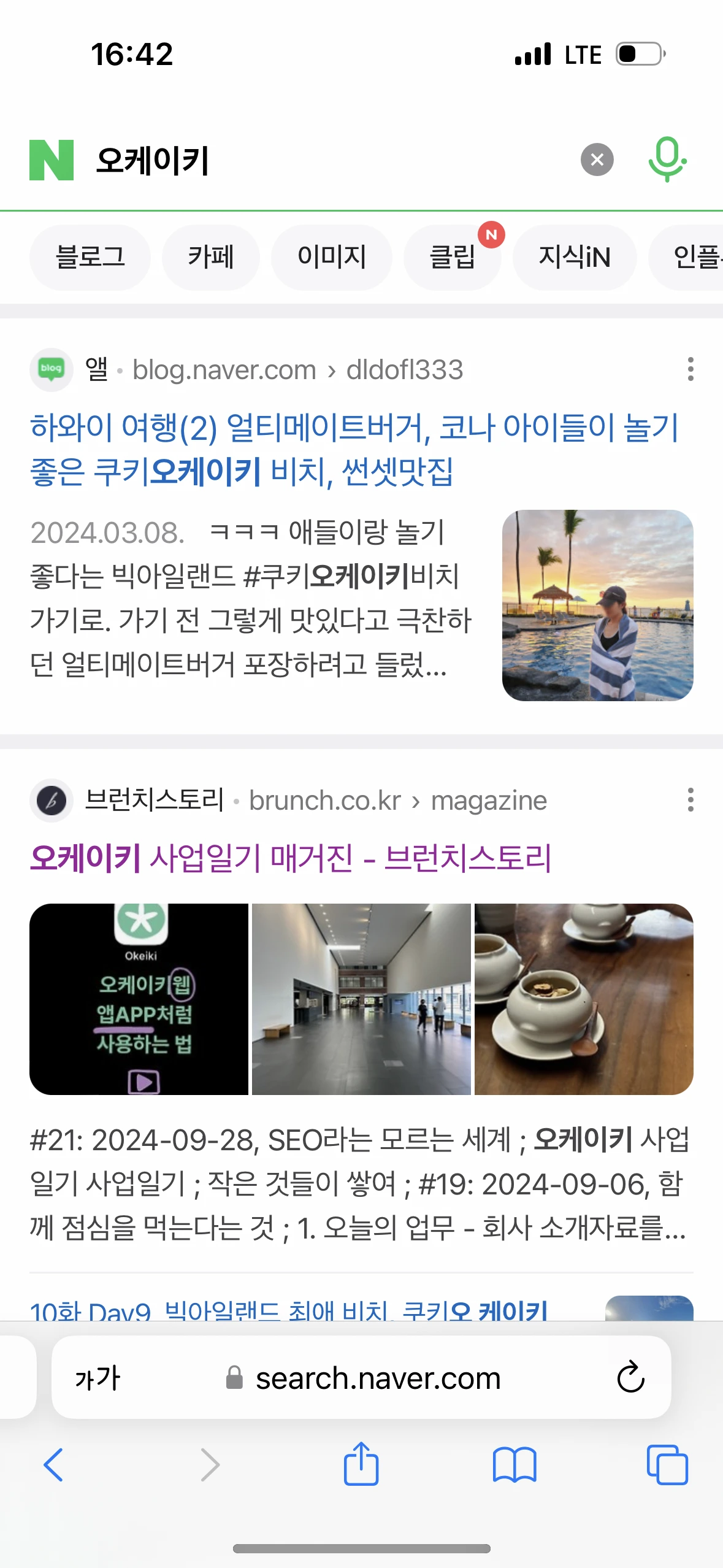 - 드디어! 네이버에 '오케이키'를 검색하면 홈페이지 url이 처음으로 나온다. 정말 감격스럽다. 판교러인 도이 님의 도움이다. 무슨 검색 '봇'이랑 SEO 최적화인가를 해주셨다. 예전에는 '오케이키'를 검색하면 하와이 관광지인 '쿠키오케이키' 해변을 소개하는 블로그 글이 나왔었는데, 9월 22일에 SEO 최적화를 시작하고 2개월 만에 우리 홈페이지 url이 처음으로 나온다.