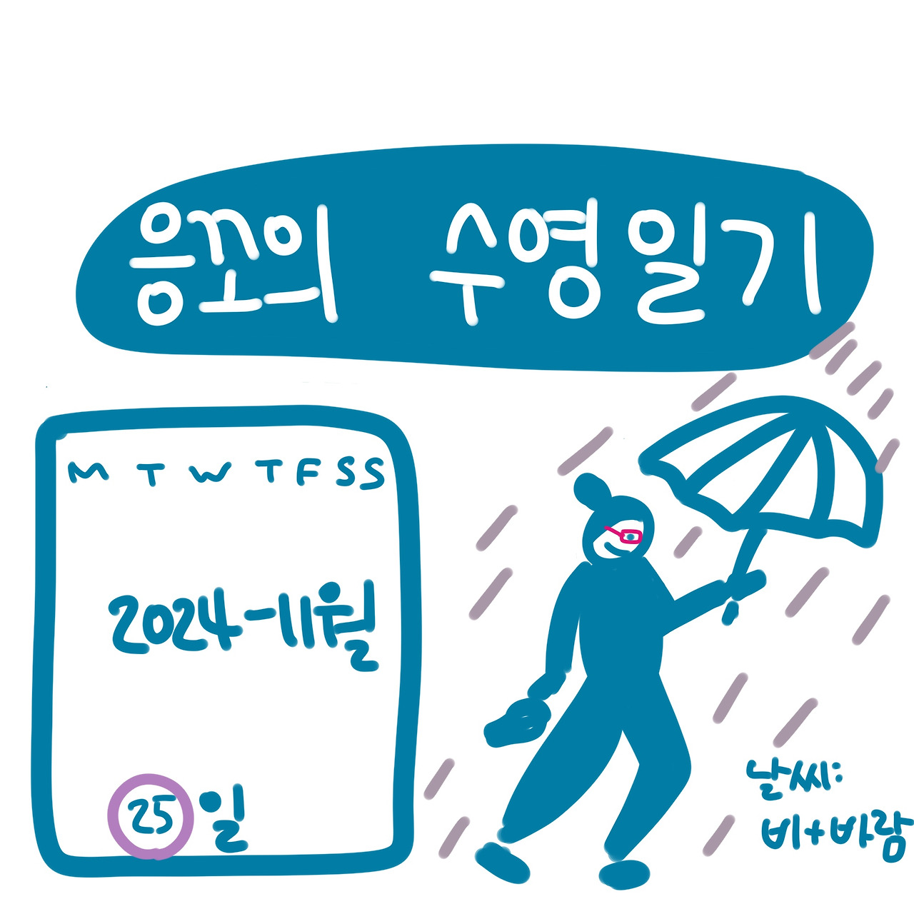 꺅 오늘도 늦었다. 근데 오늘도 7시에 일어났다. 눈곱도 못 떼고 수영장으로 뛰어갔다. 비 오는데 날씨를 확인할 새도 없이 나와서 당연히 우산도 없다. 비를 쫄딱 맞고 수영장으로 들어갔다.