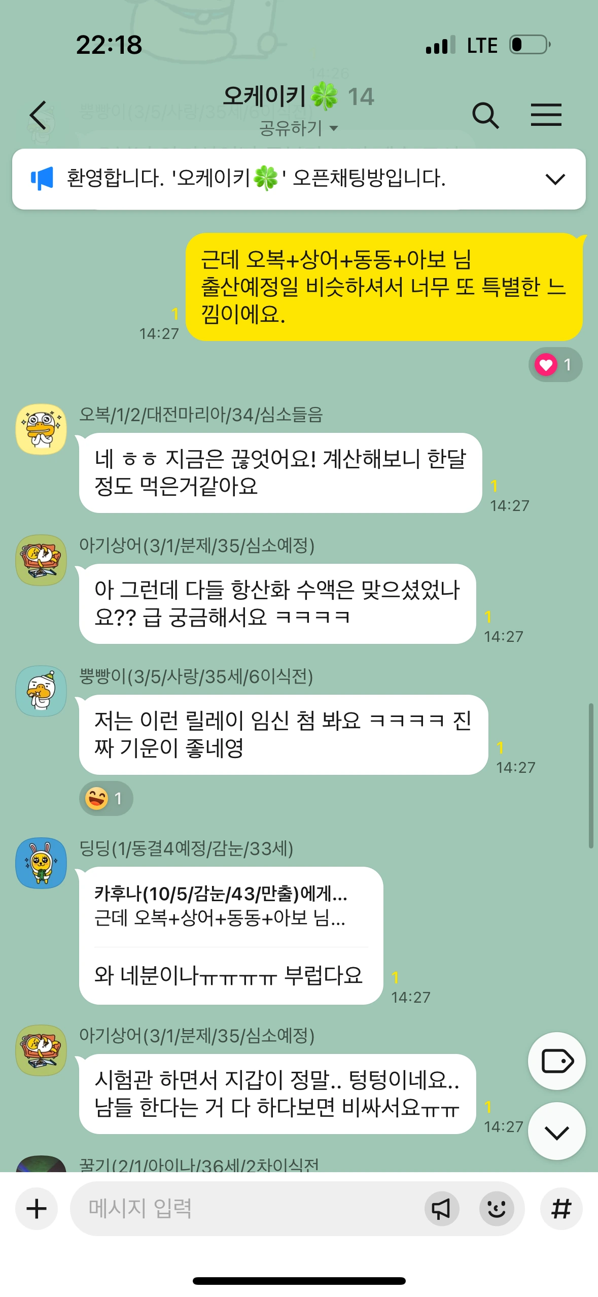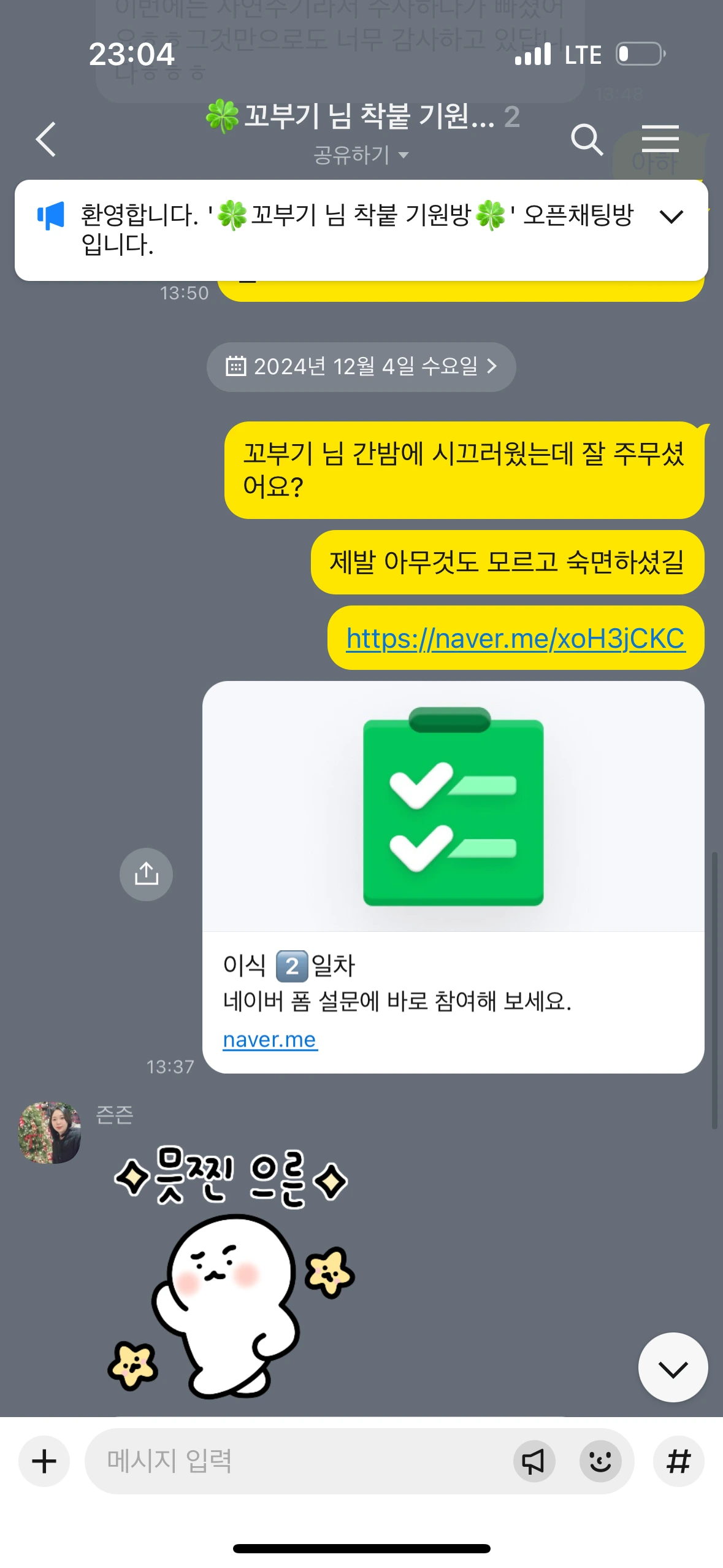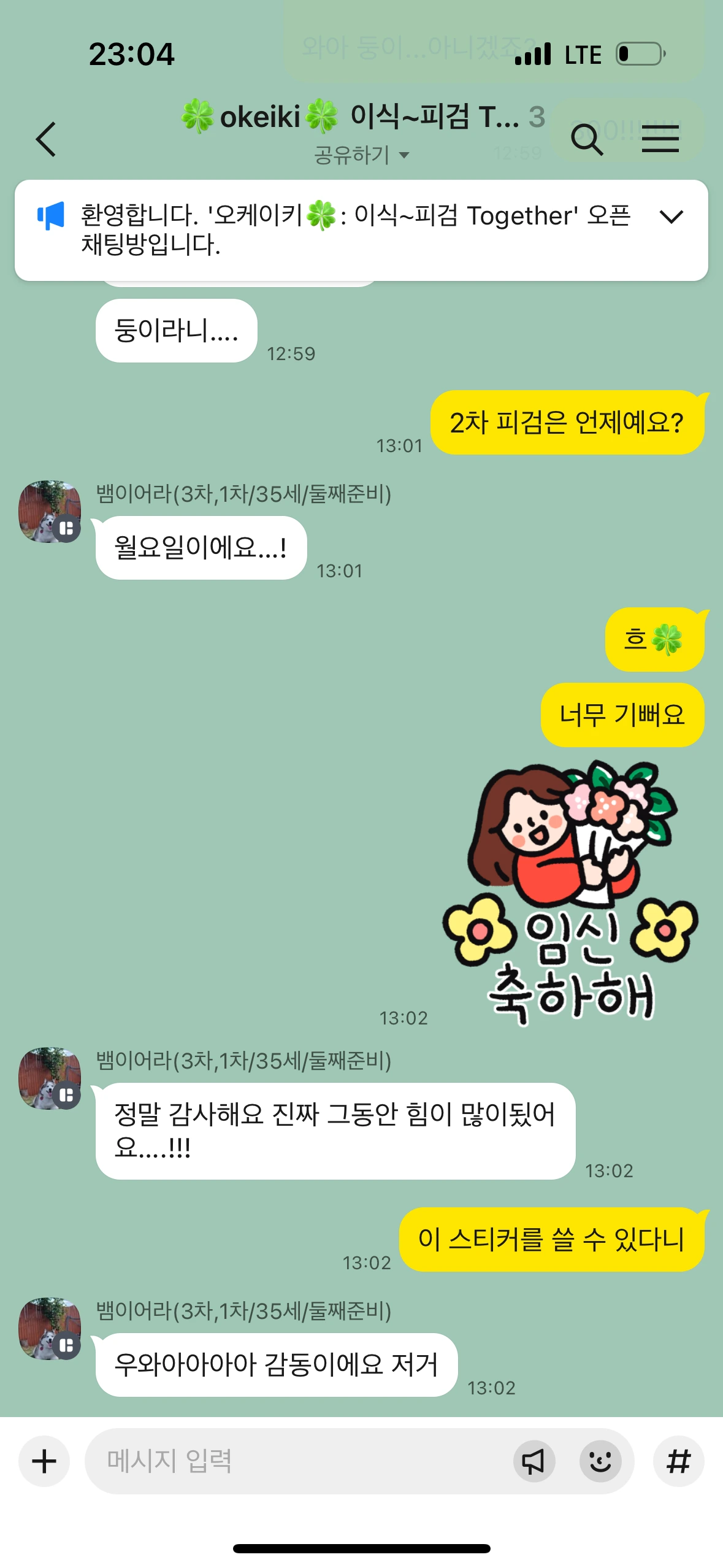 - 참여형 프로그램 두 번째 참가자 시작: 첫 번째로 참여하신 '뱀이어라 님'과 12일 동안 안부를 묻는 프로그램을 잘 마무리했다. 그. 런. 데. '뱀이어라 님'이 무려 1차 피검 수치 300으로 세상에 임신하신 것. (너무 놀라고 너무 기뻤다.) 오늘부터 새로운 분과 두 번째 프로그램을 시작한다. 12/13 금요일까지 꼬부기 님의 손을 꽉 잡아 드릴 생각이다.
