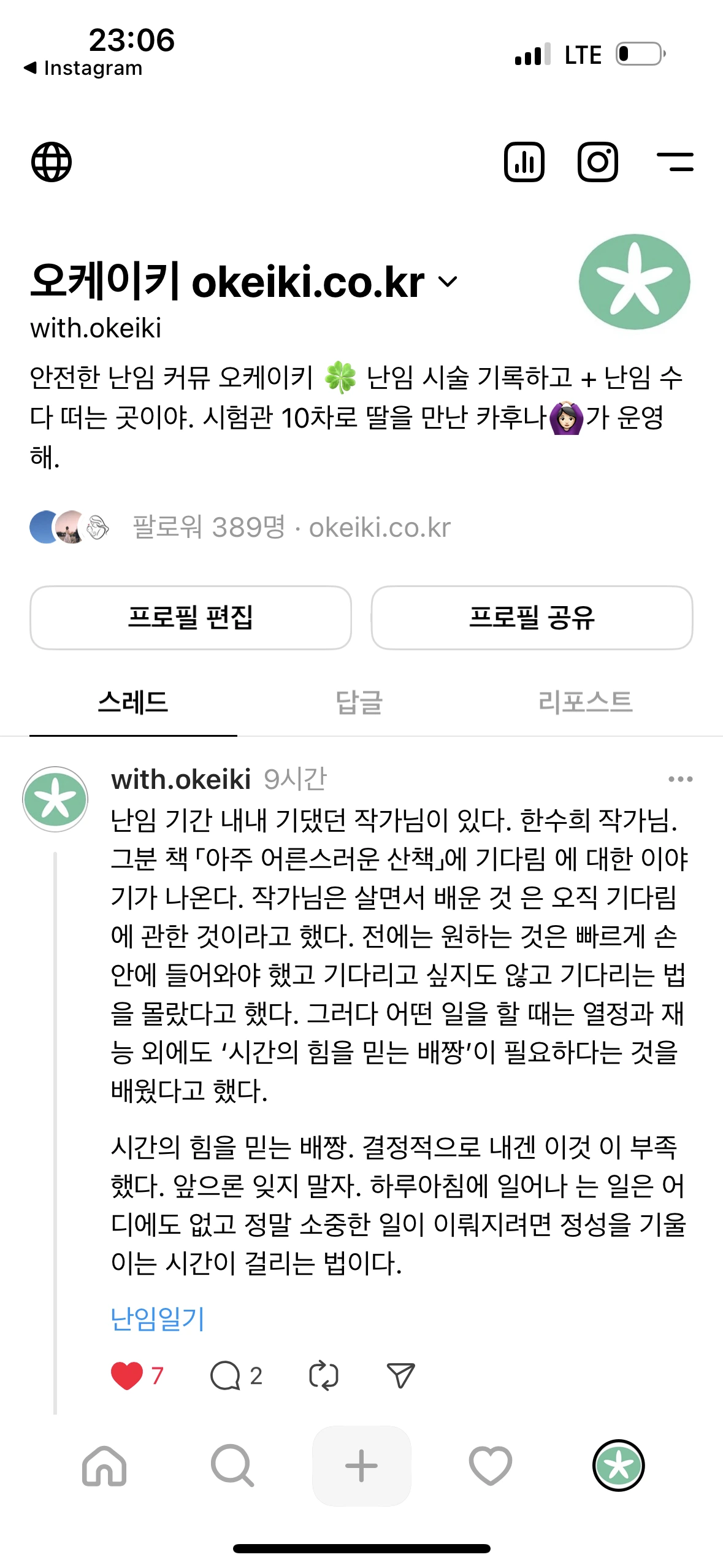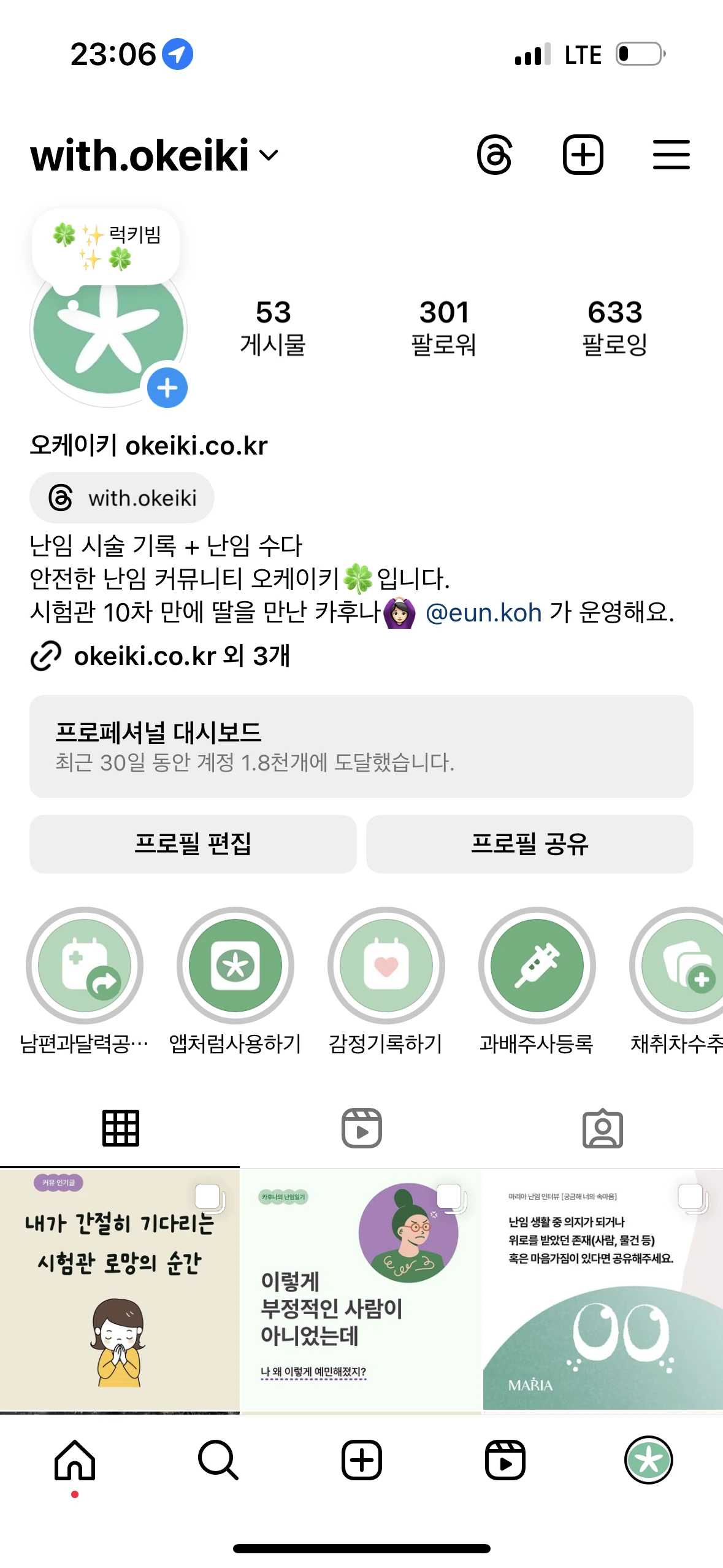 - 스레드와 인스타: 둘 다 크게 바라는 바 없이 오케이키를 꾸준히 알린다는 차원에서 무리하지 않고 계정을 운영하고 있다. 스레드는 하루에 게시물 1~2개(게시물 업로드보다는 난임 일기 계정을 찾아다니며 댓글을 다는 일에 더 재미를 붙였다.), 인스타는 자체 게시물 3개, 마리아 병원과 공동작업물로 게시하는 글 1개로 관리하고 있다. 아참, 인스타 팔로워가 300명이 되었다.