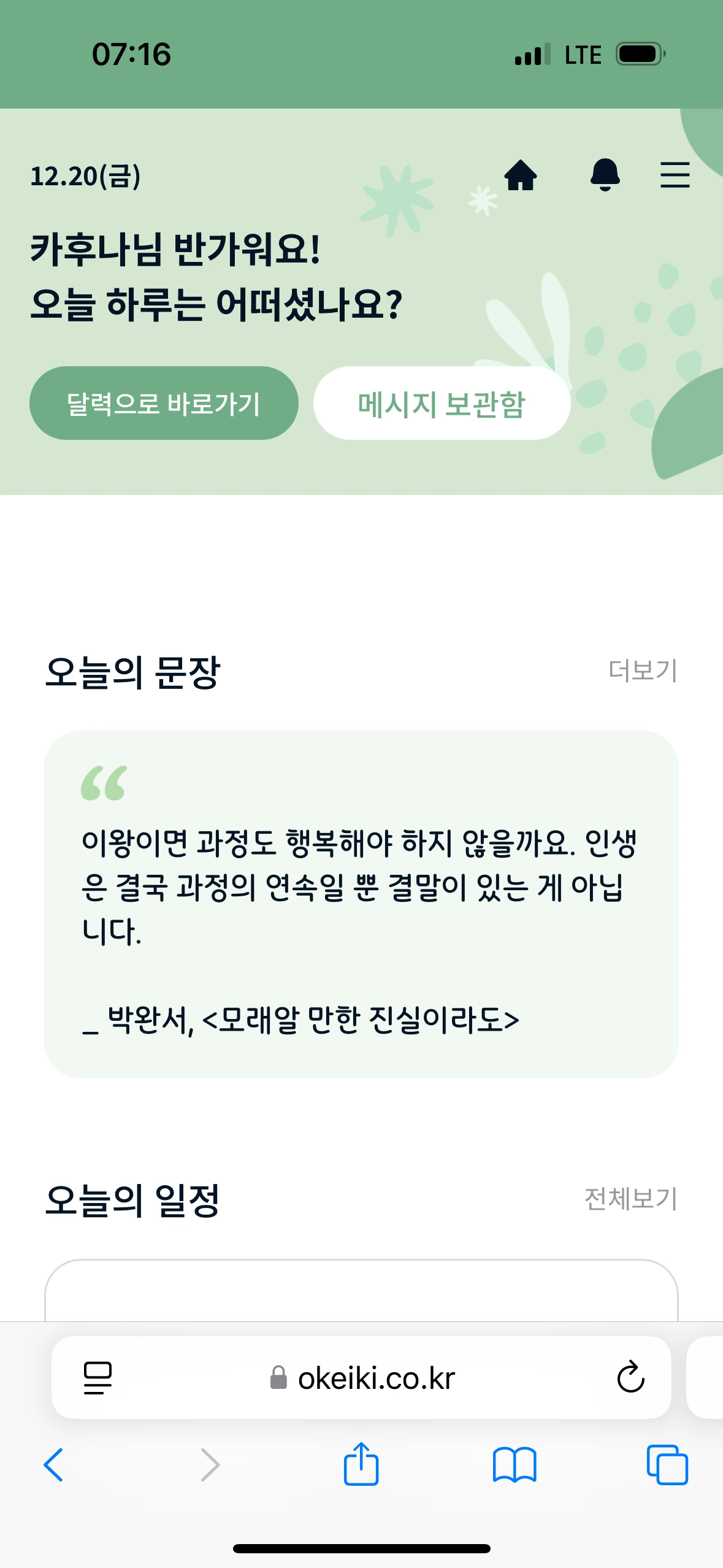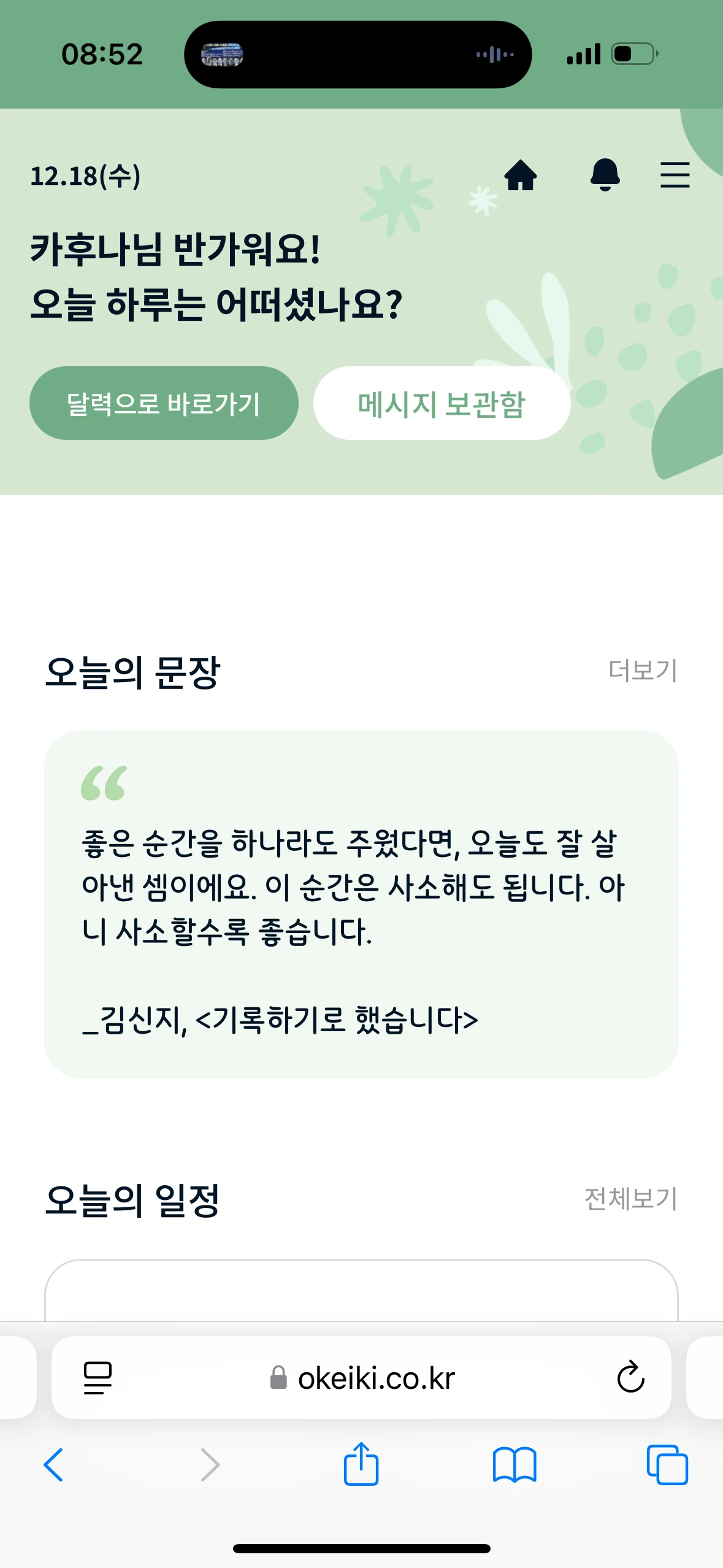 4) 홈페이지에 [오늘의 문장] 코너를 신설: '내가 할 수 있는 것을 착실히 하는 것'이 내 생활관이다. 그 마음을 오케이키 업무에 적용해 보니 매일 응원이 되는 문장 하나씩은 오케이키 웹에 올릴 수 있지 않을까, 싶어 이번 주부터 시도하고 있다.
