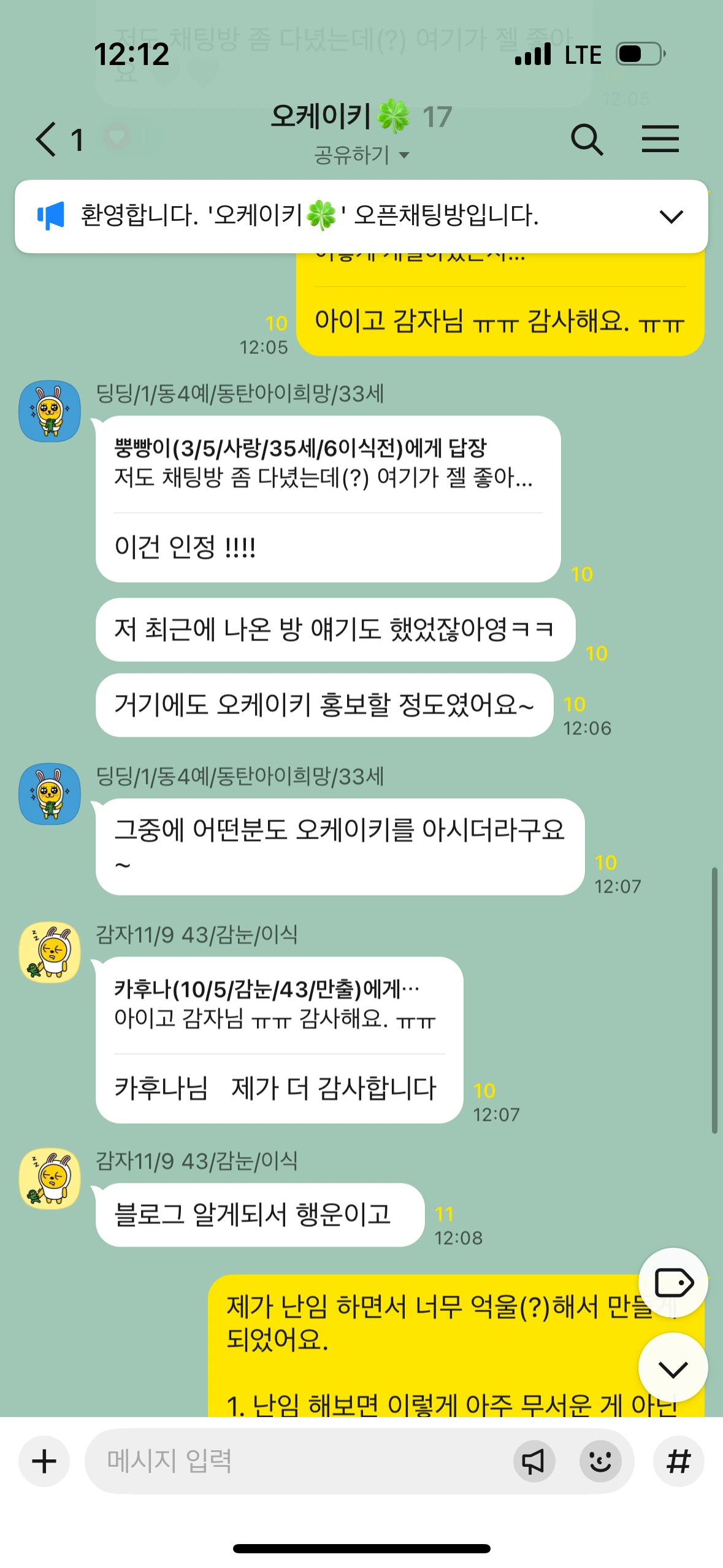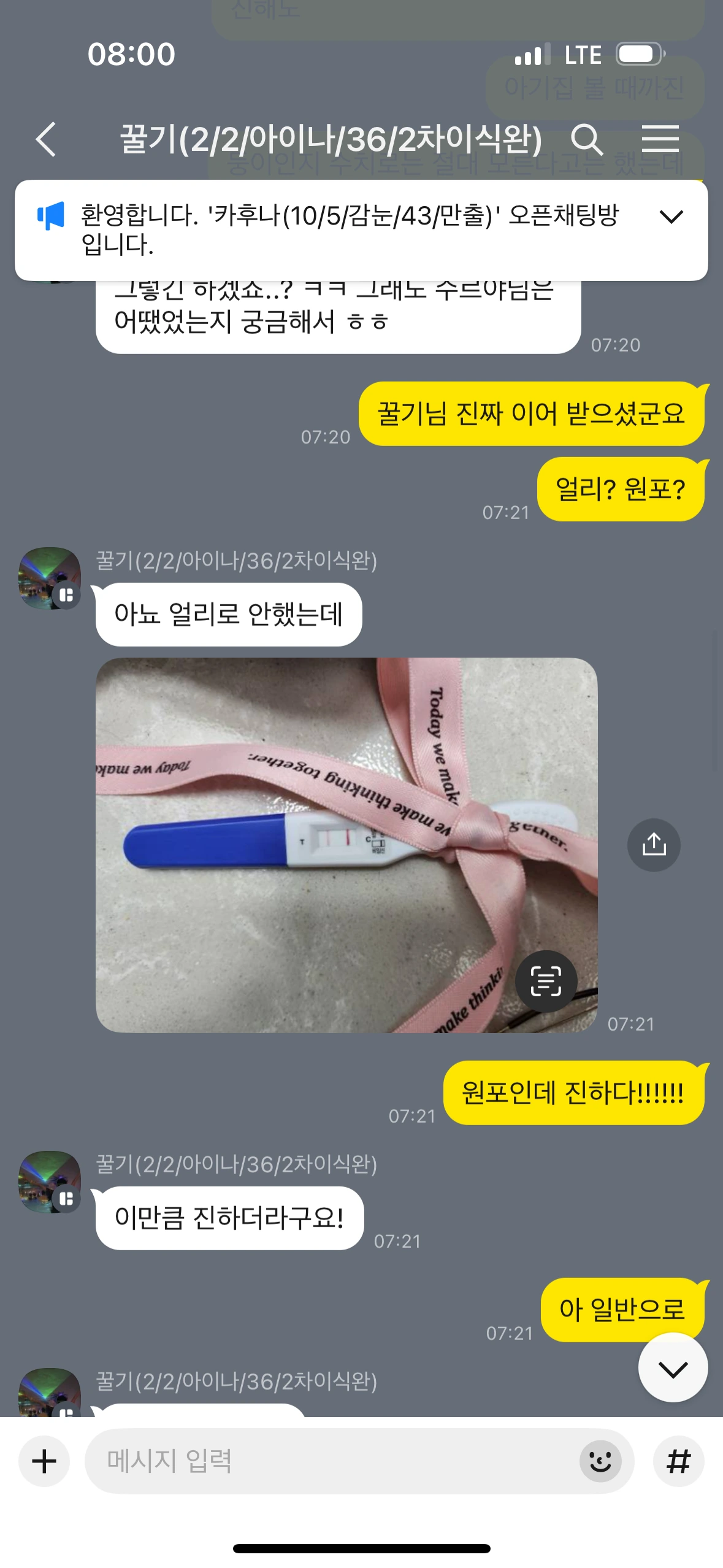 - 세 번째, 네 번째 참가자에게도 이 기운이 전달되었으면 하는 바람이다. 제발! (이 글을 올리자마자 연락이 왔다! 3번째 참가자도 임신이다. ㅠㅠㅠㅠㅠㅠㅠㅠ 심지어 방금 전 오픈 채팅방에 계신 한 분도 임테기 두 줄이라고 연락이 왔다! 와아!)
