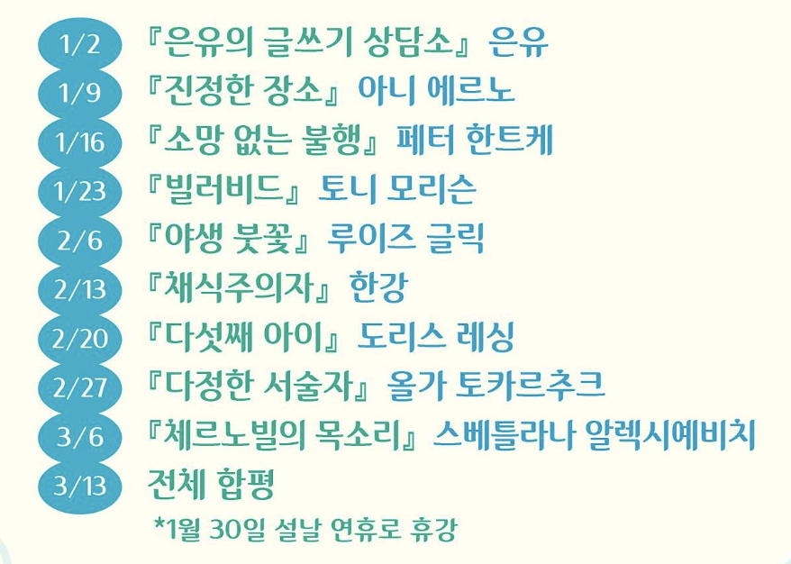 총 20명이 모였다. 80cm 정도 폭이 되는 책상에 머리와 어깨를 맞대고 앉아서 은유샘 이야기를 들었다. 먼저 앞으로 10번 만나는 동안 우리가 읽을 책에 대해 이야기하셨는데, 내가 과연 읽을 수 있을까,라고 생각했던 그 책들(무려 노벨상 수상작들)이 은유샘 말을 들으면서 '당장 읽고 싶다'의 마음으로 변했다.