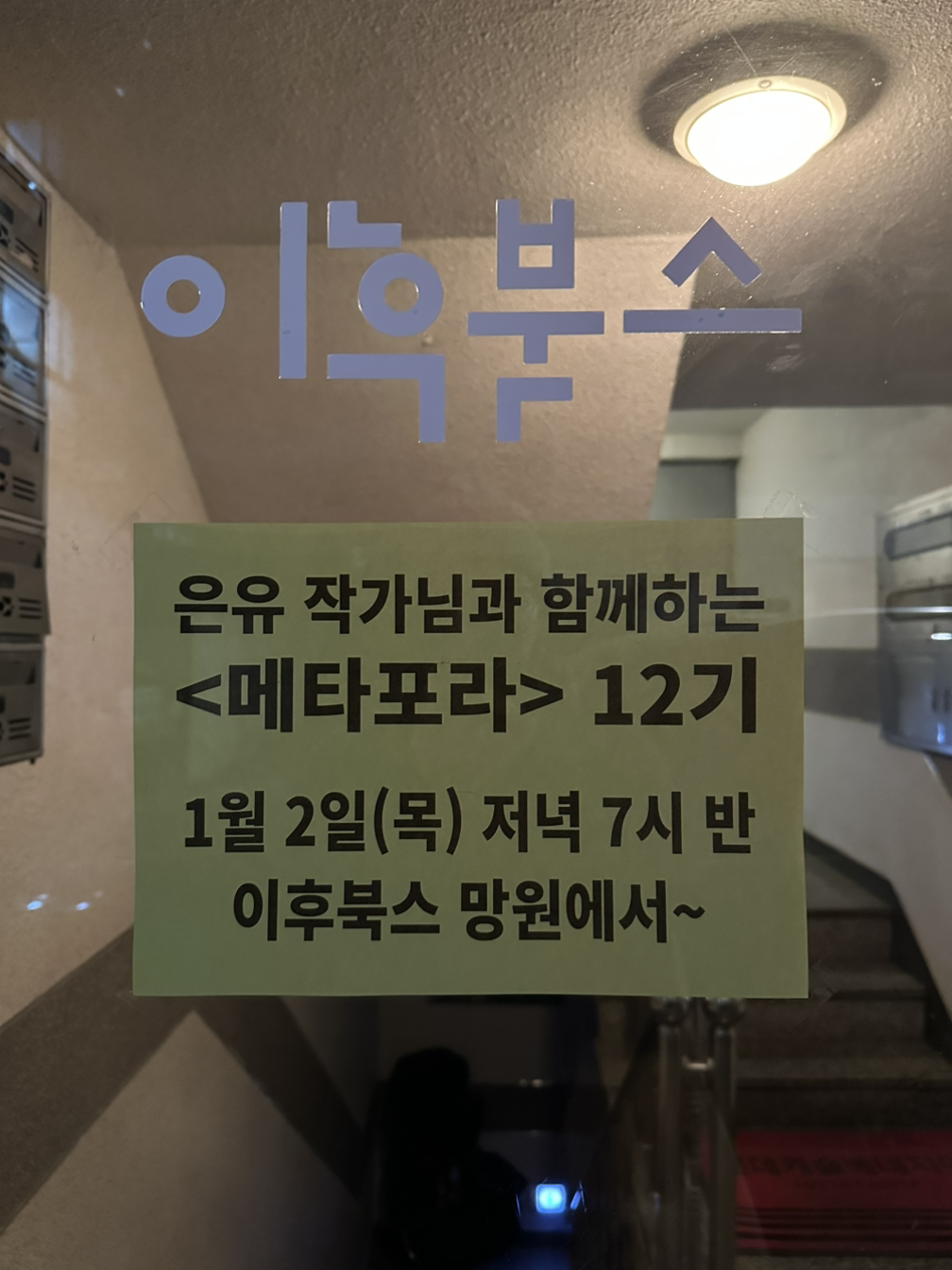 이후북스가 위치한 골목 사거리는 유난히 어두웠다. 혹시 내가 날짜를 잘못 알았을까 이후북스 인스타그램을 확인하려고 할 때, 내 앞에 바쁘게 걸어가는 두 사람이 이후북스 쪽으로 걷는 걸 봤다. 오늘이 맞나 보다. 서점 문을 열고 들어가니 은유 선생님이 동그란 안경을 쓰고 웃으며 맞아 주었다. 좋아하는 사람을 보면 다들 그러지 않나? 눈을 피했다. 나이가 들어서도 이렇게 부끄러운 마음이 드는 건 왜일까.