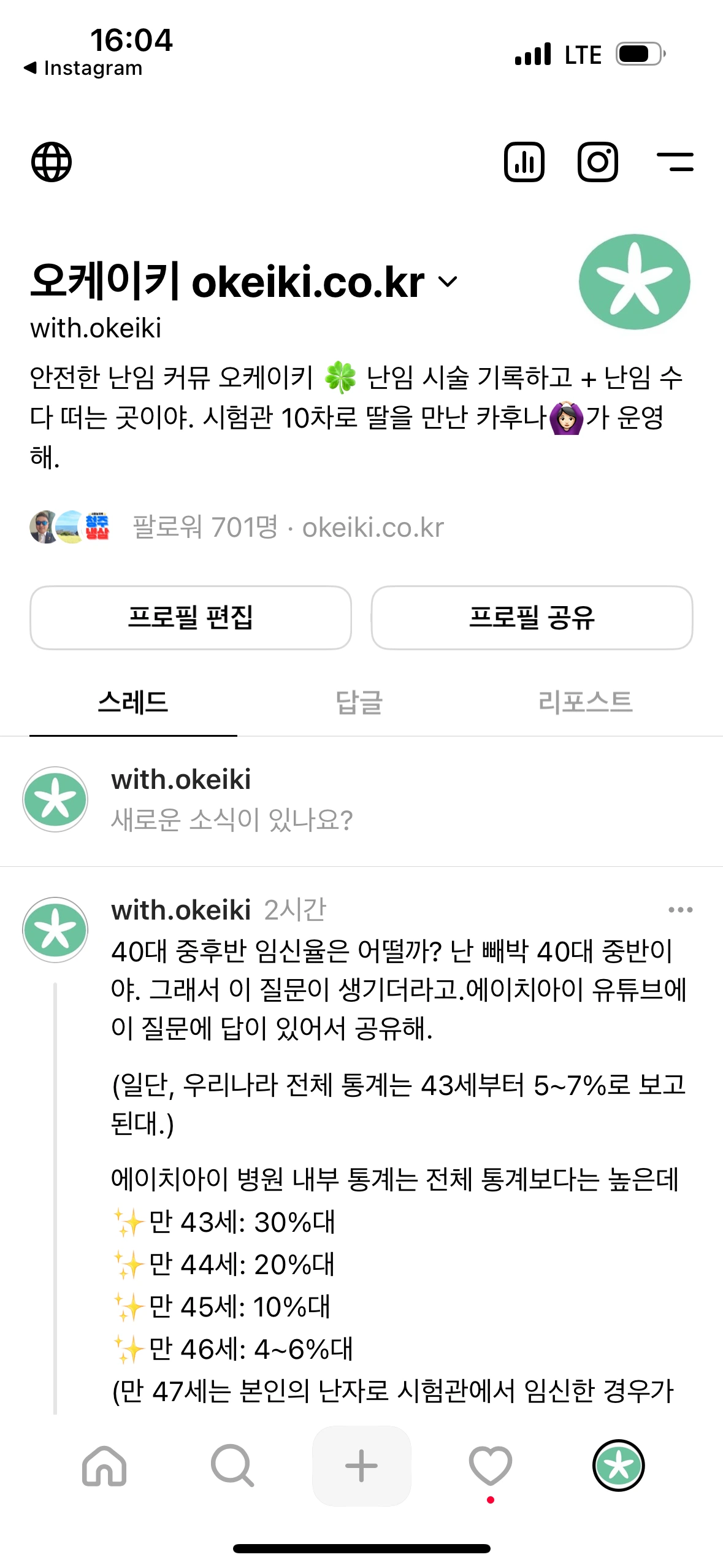 - 그리고 스레드에서 오케이키를 만난 분들은 홈페이지에 들어와서 게시글도 보고, 시험관 시술 기록 기능도 이용하신다.