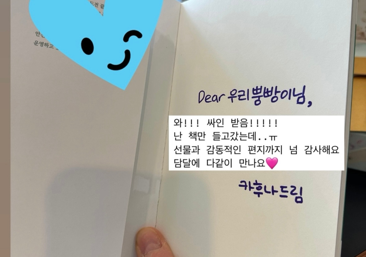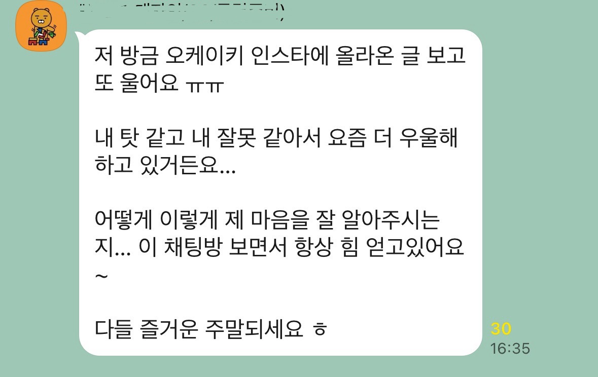 - <오케이키 편지>에서 매월 한 명씩 인터뷰한 내용을 발행하는데, 6월의 주인공은 뿡빵이님! 오케이키 오픈채팅방에서도 부방장처럼 많은 사항을 챙겨 주시는 꼼꼼한 뿡빵이님을 만났다. 만나려고 어디서 오시는 게 좋은 지를 묻다가 알게 되었다. 나랑 같은 동네 주민이었다!