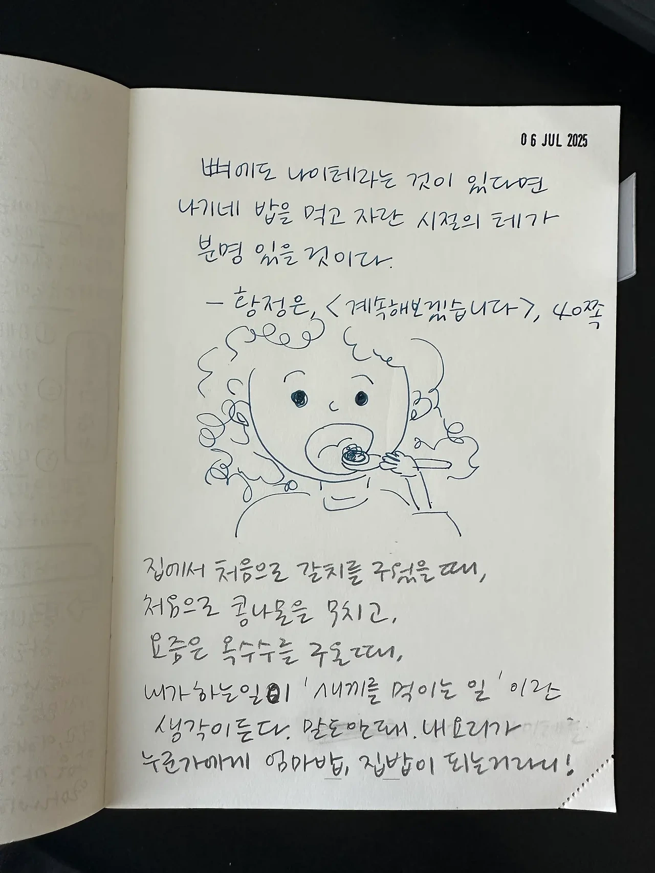딸 입에 넣어주겠다고 처음으로 갈치를 구운 날, 콩나물무침을 처음 해낸 날, 알 수 없이 깊이깊이 뿌듯했는데, 새끼를 먹이는 일을 하고 있어서 그랬구나. 내가 하는 음식이 누군가에게 집밥, 엄마 밥이 되는 거라니 세상에.
