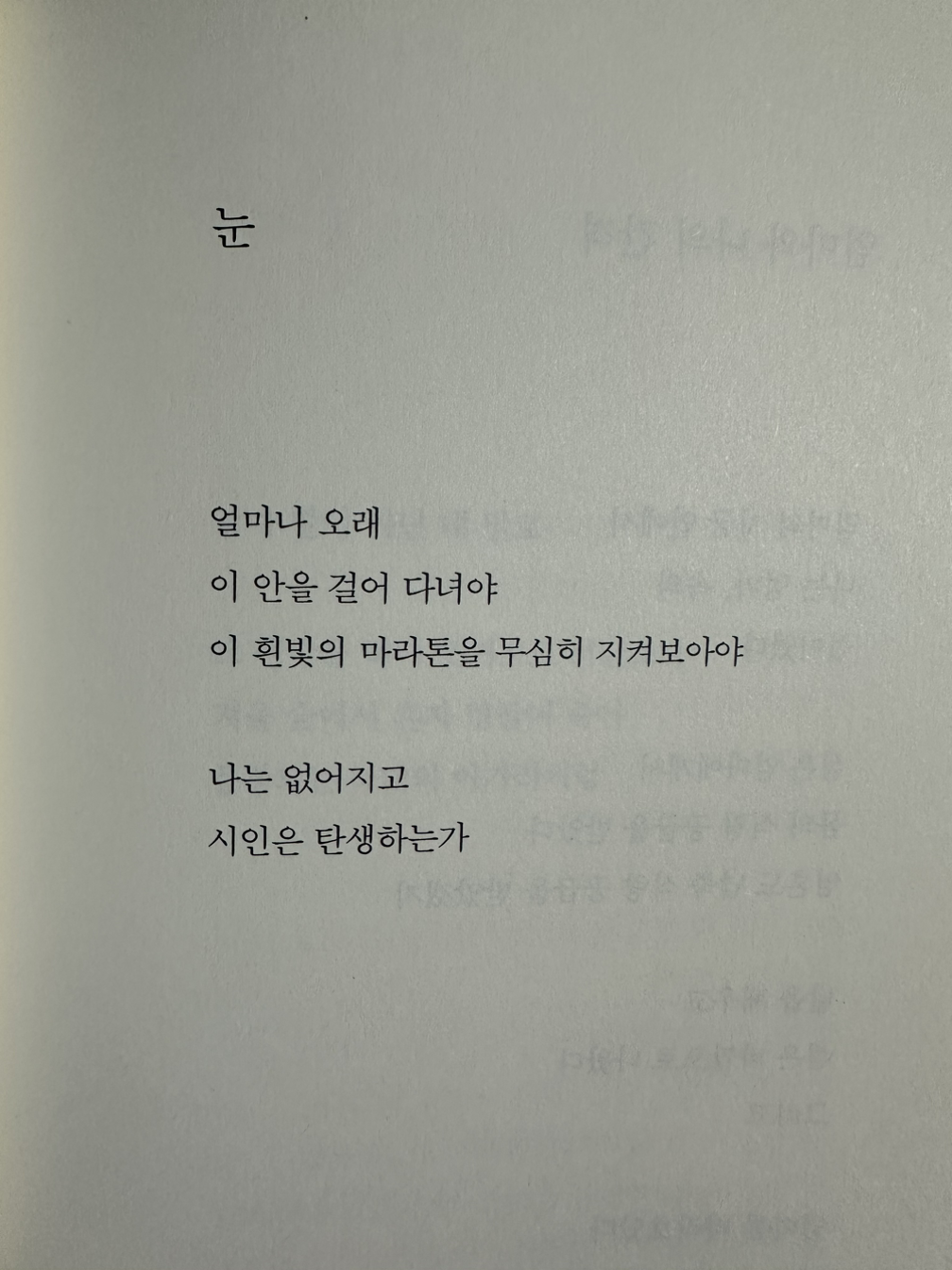 이번 주는 대체로 무기력했고 자주 나이드는 것에 두려웠으며 책도 읽어지지 않는 날들의 연속이었지만, 그럼에도 불구하고 책을 읽고, 일기를 쓰고, 시를 외우고, 시를 외우며 눈 속을 걸었다. 이렇게 두고 보니 이만하면 괜찮은 한 주처럼 보인다.