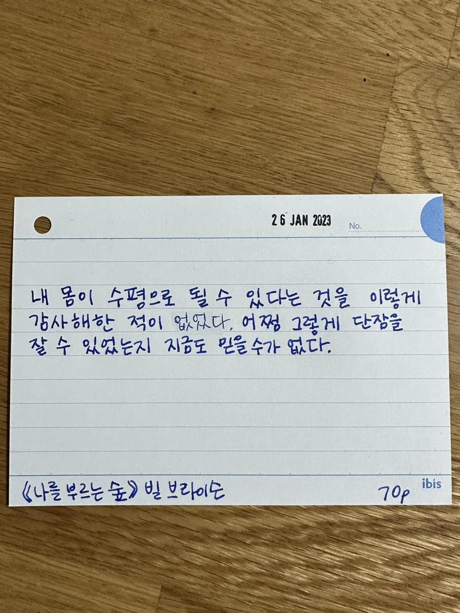 요즘도 자주 침대에 누울 때마다 이 날의 수평자세를 생각한다. 눈을 감고 있으면 그 침대에 누워있는 것 같기도 하고, 밖으로는 쏴아 빗소리도 들리는 것 같다. 그러면 자연스럽게 지금 누워있는 내 침대에게 감사하게 되고, 오늘 놓치고 감사하지 못한 것은 없나 하나씩 생각해 보게 된다.