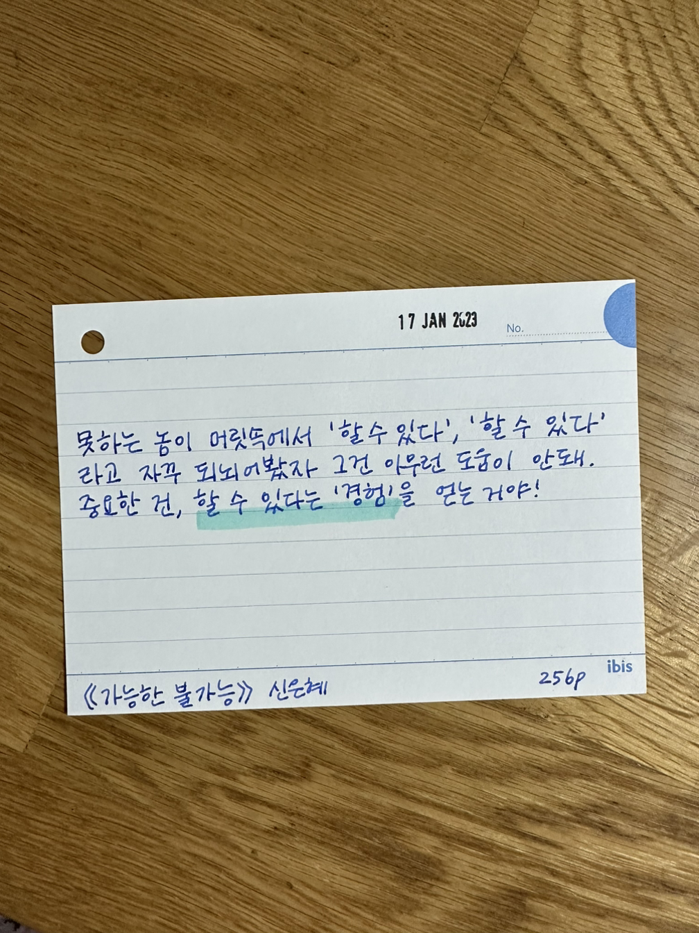 내가 나를 믿어줘야 도전을 할 동력이 생기는데, 할 수 있다는 마음만 가지고는 몇 미터도 가기가 어렵다. 오히려 ‘이게 될까?’, ’안 될 것 같은데.’, ‘그래도 한번 해보지 뭐.’가 필요하다. 일단 저질러보지 않으면 경험을 얻을 수가 없기 때문에. 결국 경험을 타고 다음 경험으로 날아갈 수밖에 없어서 아주 작은 경험이라도 얻는 것이 무척 중요하다. 책에서 나온 이야기처럼 우주복 헬멧에 대한 두려움을 벗어나기 위해 일단 선글라스를 써보는 것이 필요하다. 운전에 대한 두려움을 가진 작가가 운전면허 시험 문제집을 사는 것처럼. 도전하고 싶은 것이 있으면 아주 작은 경험을 해보자 다짐한다. 나를 잘 달래서 내가 웃으며 쉽게 할 수 있는 범위로 소분해서 한 발씩만 딛게 하고 싶은 2023년이다.