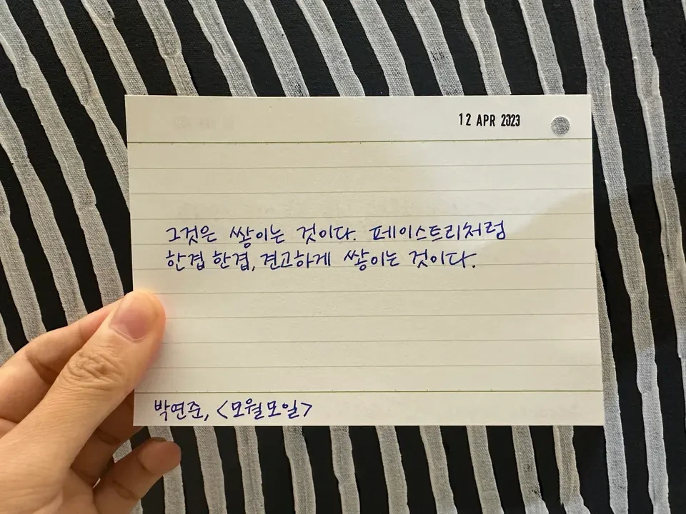 그리고 지금 나에게는 무엇이 쌓이고 있는지도 가끔 생각해 봐야겠다. 경험, 지식, 노화, 각질, 가고 싶은 여행지들, 뭐든. 쌓이는 것들은 조용할 테니 더 주의를 기울여 봐야겠다.