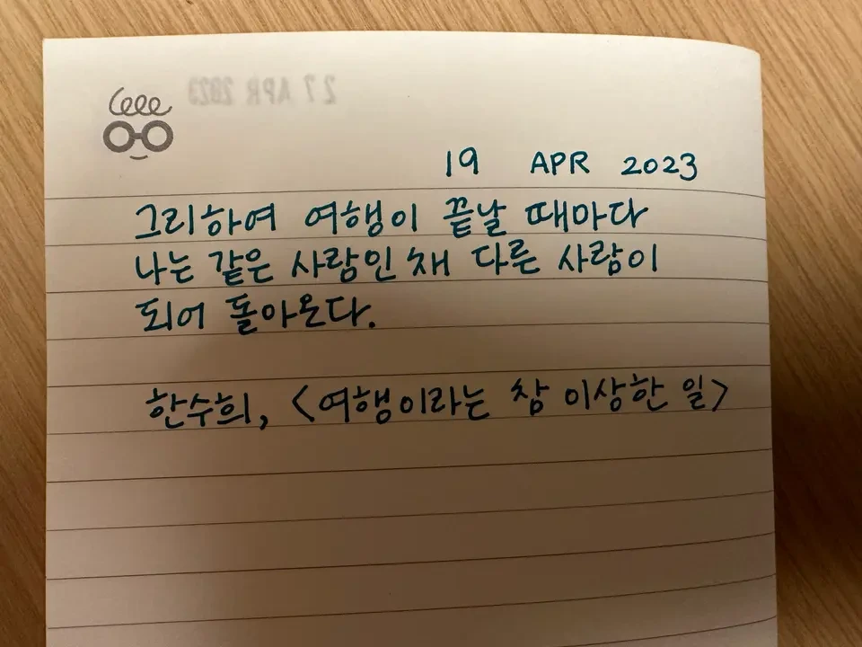 아무튼 도대체 무슨 마음으로 이곳에 있어야 할지를 모르겠어요. 내가 지금 여기 있는 것이 아무래도 어색합니다. 뭐라도 붙잡을 것이 필요해요. 역시 흔들리는 마음을 붙들어 매주는 것은 문장이죠. 구원을 찾아 에버노트 독서 정리 폴더를 열였습니다. 그리고 ‘여행’이라고 검색하고 읽다가... 역시 마음을 파고들어 와서 떡하니 자리를 잡는 것은 갓수희 작가님의 문장. ‘여행이 끝날 때마다 나는 같은 사람인 채 다른 사람이 되어 돌아온다.‘