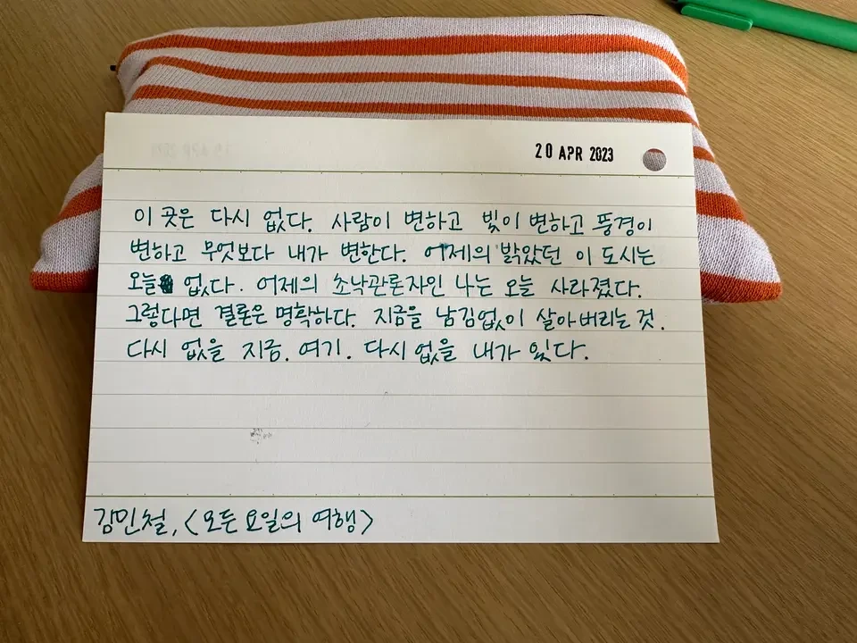 갑자기 와서 어색하지만, 일단 여행을 왔으니 잘 놀아보자 다짐을 했습니다. 습관은 여행을 와도 눈치 없이 따라와서 가지고 나갈 문장을 찾아 에버노트를 뒤적였습니다. 그리고 이 문장을 적고 가지고 나가서 하루를 보냈습니다.