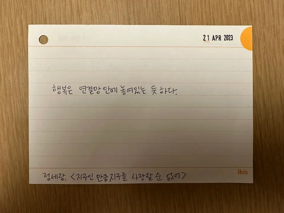 어젯밤 일기를 쓰는데 여행 중 내가 좋았던 것도 쓰지만 남편이 환하게 웃고 있던 순간도 쓰고 있었다. 이곳이 보고 싶었던 것인지 이곳에서 웃고 있는 남편의 모습을 보고 싶어서 온 것인지 모르겠다. 또 누가 웃는 풍경을 보고 싶은지 궁금해졌다. 정세랑 작가의 말처럼 내 행복은 분명 나와 연결된 것들 사이에 놓여있을 테니.