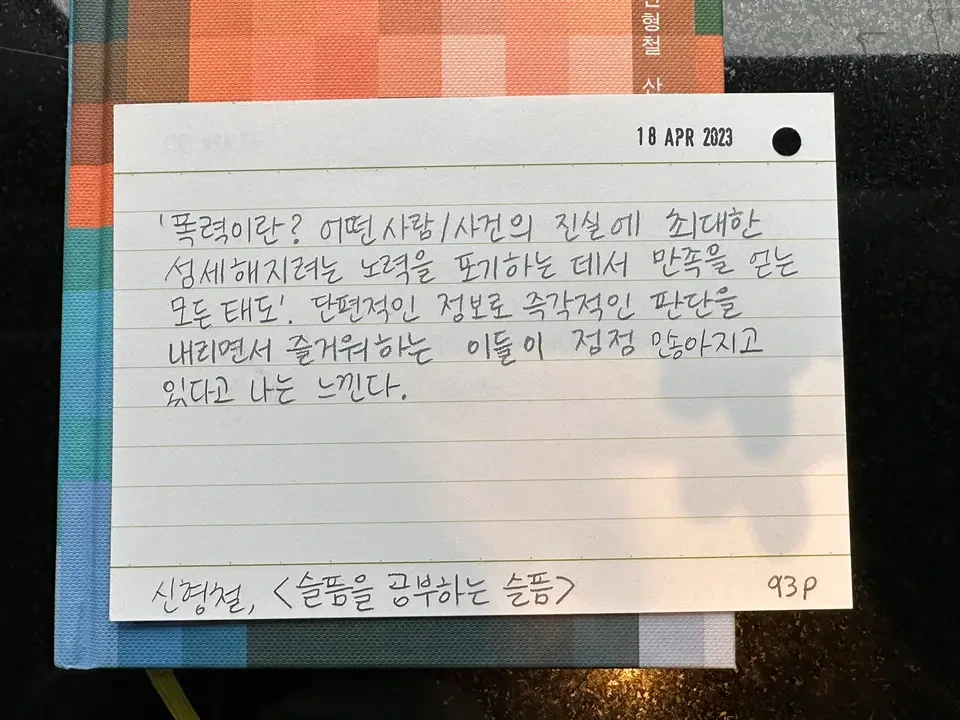 '폭력이란? 어떤 사람/사건의 진실에 최대한 섬세해지려는 노력을 포기하는 데서 만족을 얻는 모든 태도. 단편적인 정보로 즉각적인 판단을 내리면서 즐거워하는 이들이 점점 많아지고 있다고 나는 느낀다.