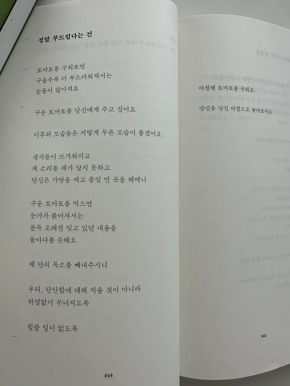 오늘 아침 <정말 부드럽다는 건> 이 시가 저에게 답 해주더군요. 너 말이야 부드러워지고 싶어서 시를 읽는 거야. 이 시에서 말하는 아침에 토마토를 굽는 일이 저에게는 시를 읽는 일인 것 같아요. 구울수록 눈물이 많아지고, 오래전 잊고 있던 마음이 생각나고, 제 안의 독소가 빠지니까요.