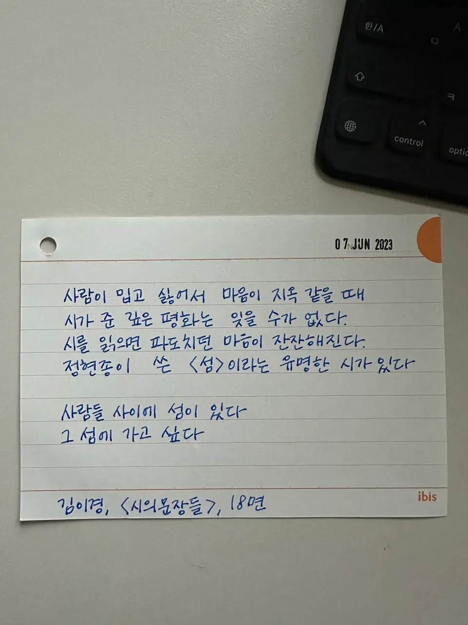예전 직장에 낮은 파티션 하나를 두고 나란히 앉아 근무하던 부장님이 있었어요. 부장님도 저를, 저도 부장님을 힘들어했습니다. 아침 8시부터 저녁 7시까지 숨소리까지 들리는 거리에 앉아서 지낸 시간에 이 시를 알았다면 얼마나 좋았을까요? 마음속으로라도 사이에 섬이 있다고 떠올릴 수 있었다면 그렇게 힘들지 않았을 텐데요.
