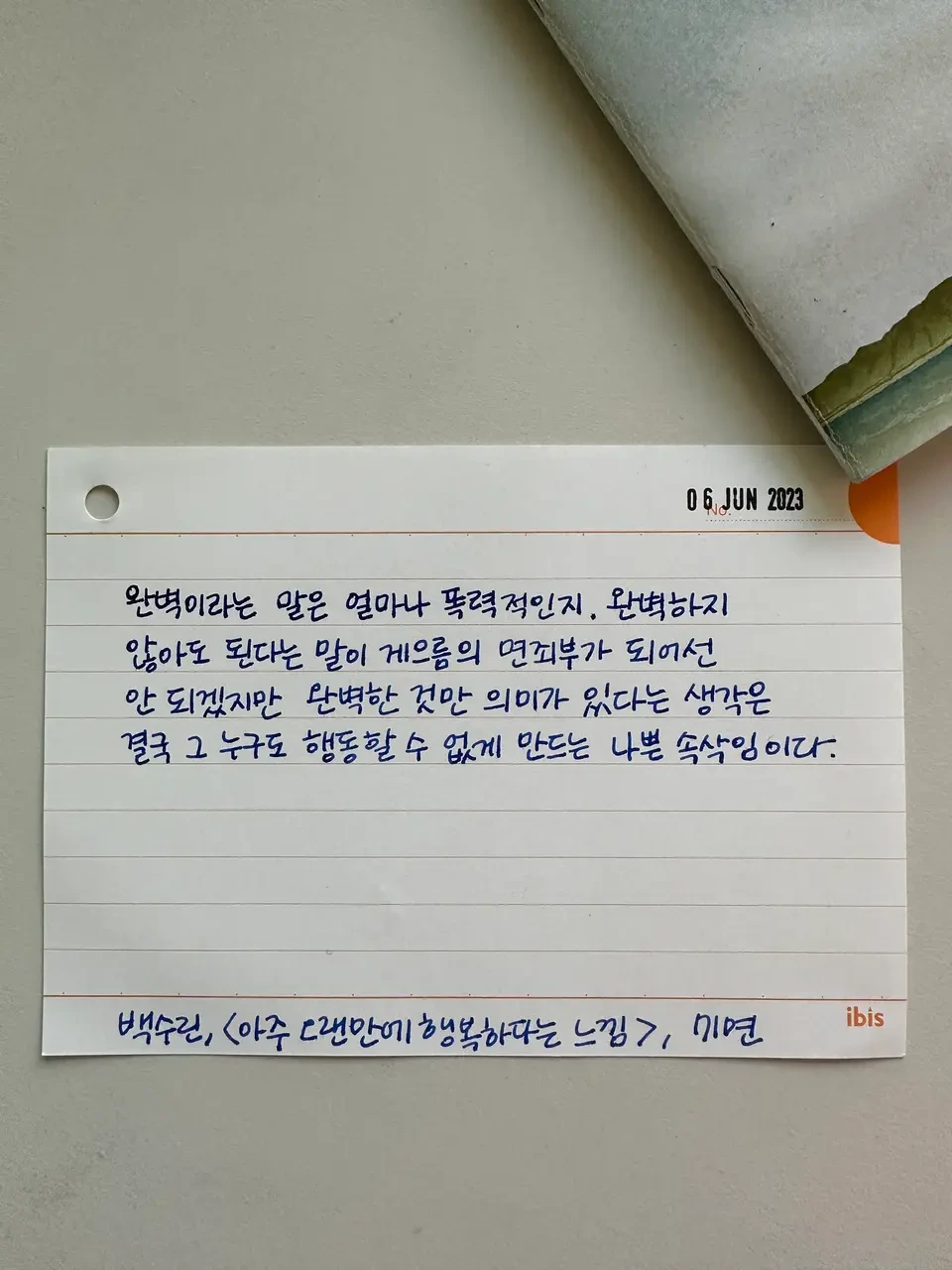 완벽이라는 말은 얼마나 폭력적인지. 완벽하지 않아도 된다는 말이 게으름의 면죄부가 되어선 안 되겠지만 완벽한 것만 의미가 있다는 생각은 결국 그 누구도 행동할 수 없게 만드는 나쁜 속삭임이다.