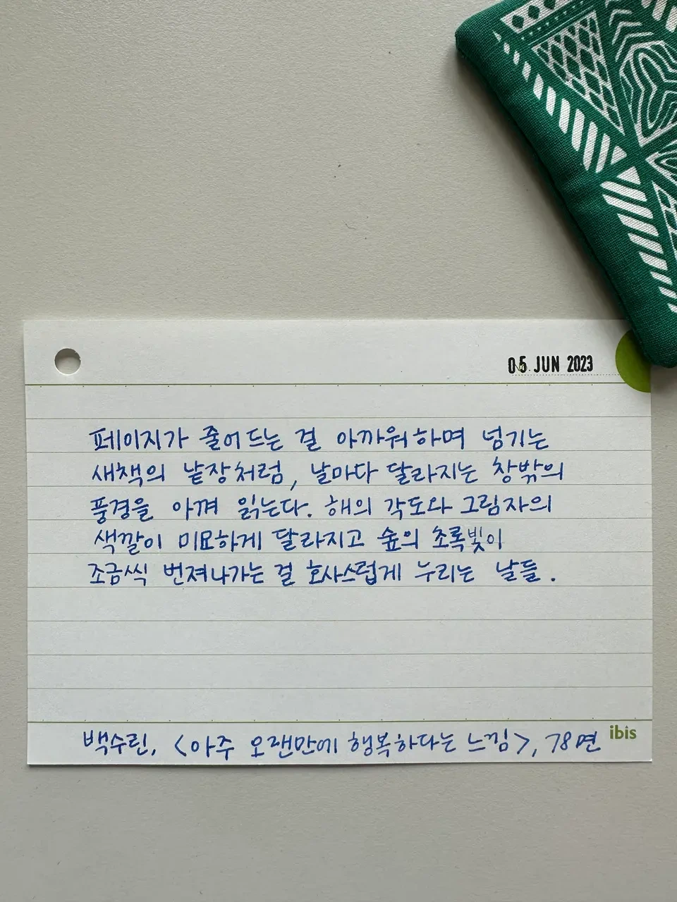 오늘은 망종(芒種)이다. 이십사절기 중 하나로 일 년 중 논보리나 벼 등의 곡식의 씨를 뿌리기에 가장 알맞다는 날이다. 계획을 세웠다. 앞으로 망종마다 내 마음에 뿌리고 싶은 문장을 골라보는 것이다. 2023년 내 마음의 밭에 뿌리고 싶은 문장은 바로 이 백수린 작가의 말이다. 완벽한 것만 의미가 있다는 나쁜 속삭임을 얼마나 자주 했던가. 마음속에 100점을 맞으려고 아등바등하는 어린애가 살고 있는데, 70점도, 80점도 괜찮다고 달래 봐야겠다. 그러면 인생에 좀 더 많은 행동들이 자랄 수 있겠지.