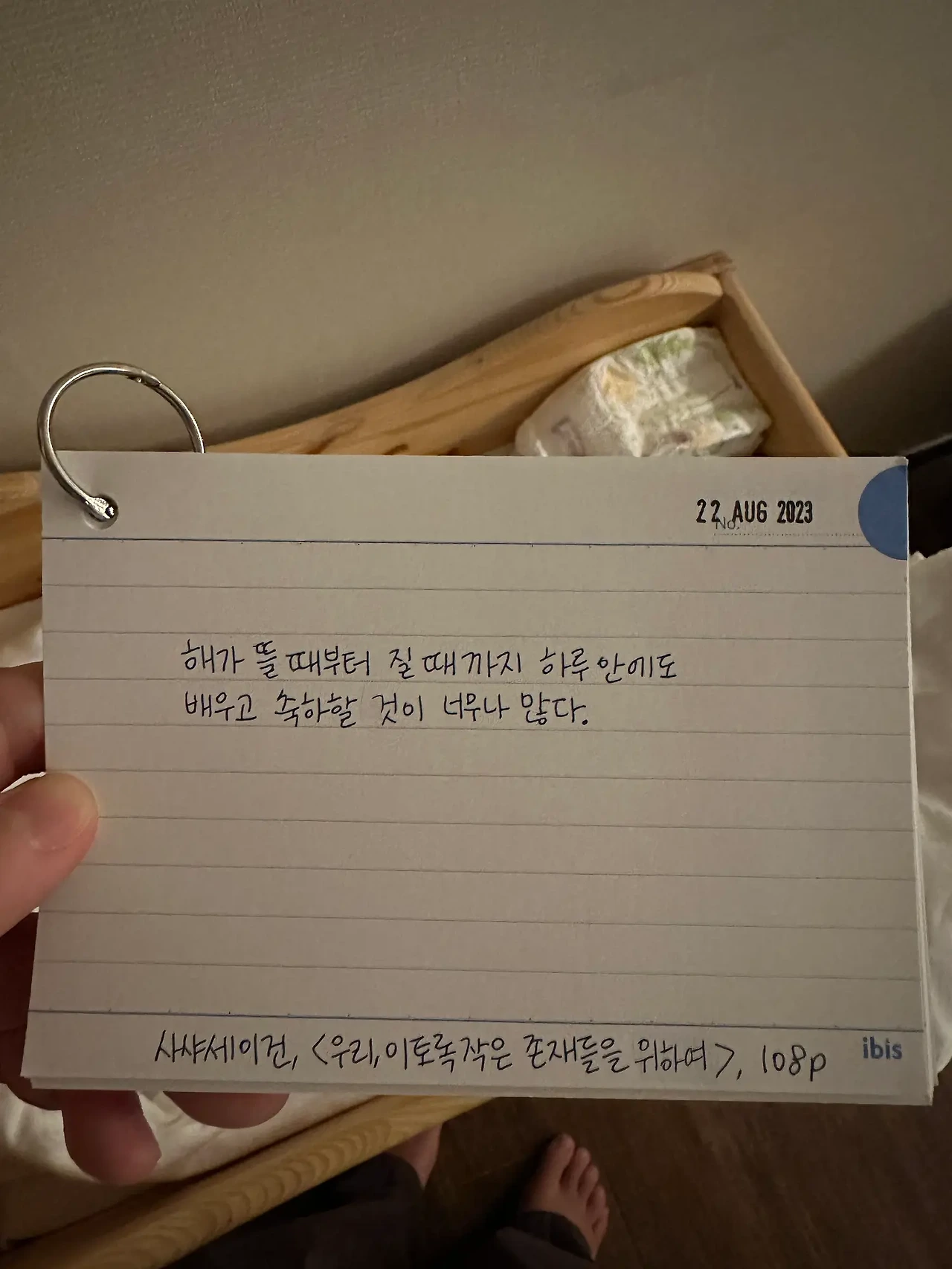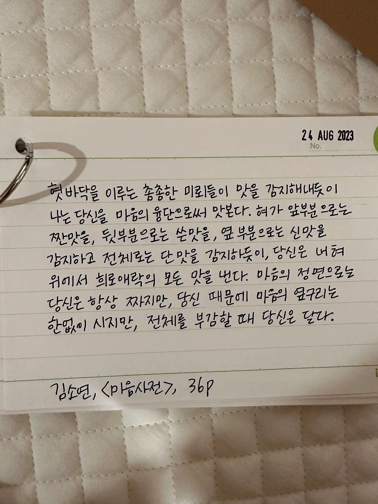 같은 리추얼을 1년 넘게 하니 이런 기쁨이 있군요. 22년 오늘 썼던 문장메모를 타고 작년 마음에 다녀왔어요. 그날에는 상상할 수 없는 곳에 도착해 있어서 더 강하게 다가와요.