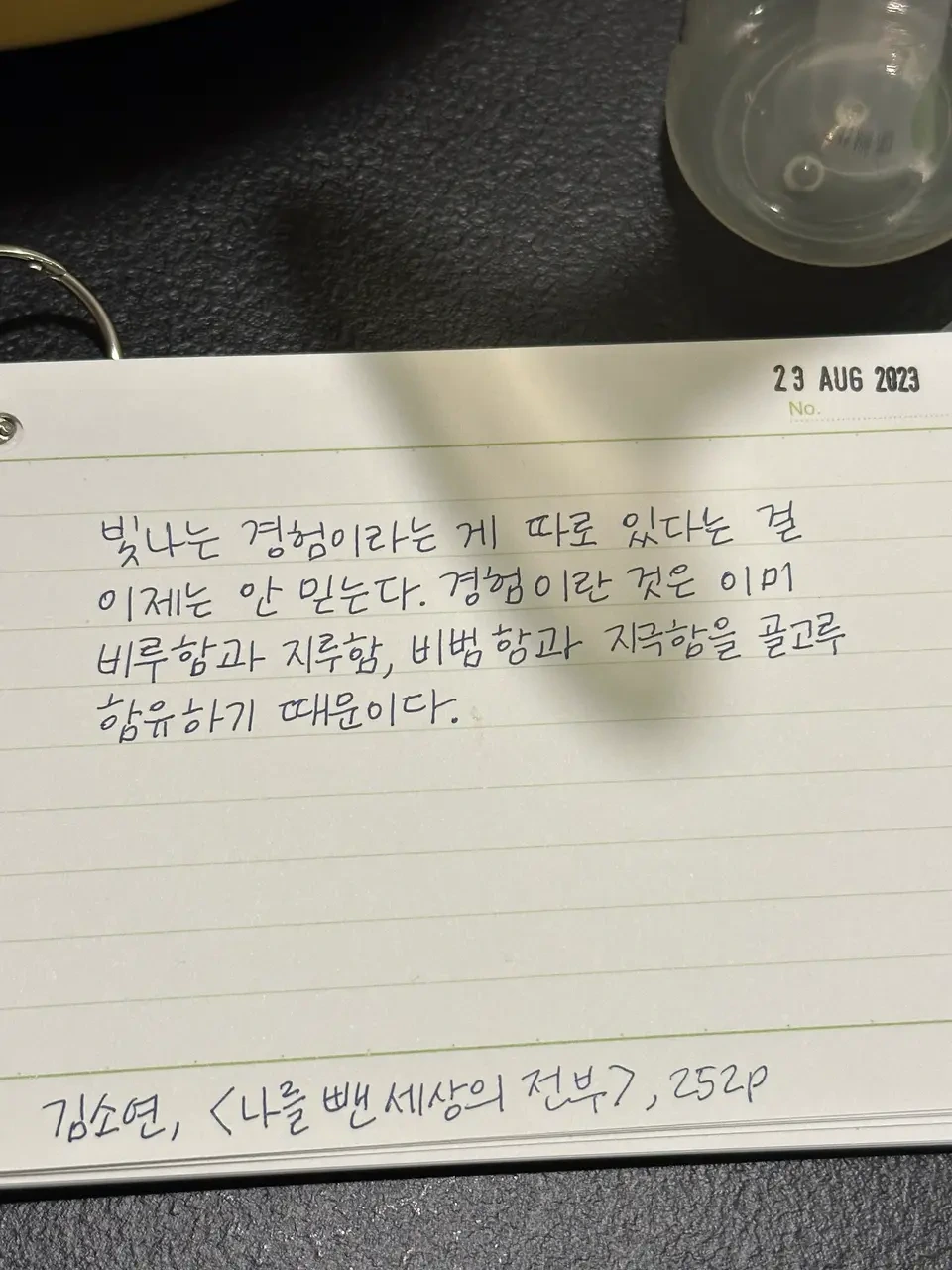 빛나는 경험이라는 게 따로 있다는 걸 이제는 안 믿는다. 경험이란 것은 이미 비루함과 지루함, 비범함과 지극함을 골고루 함유하기 때문이다.