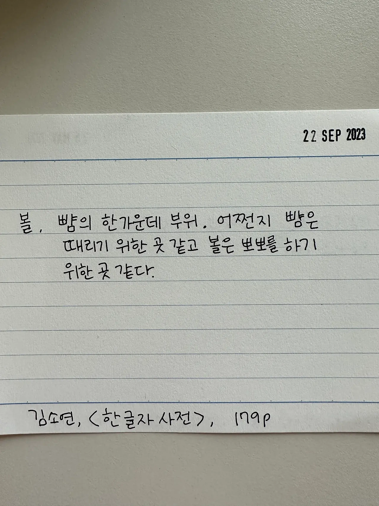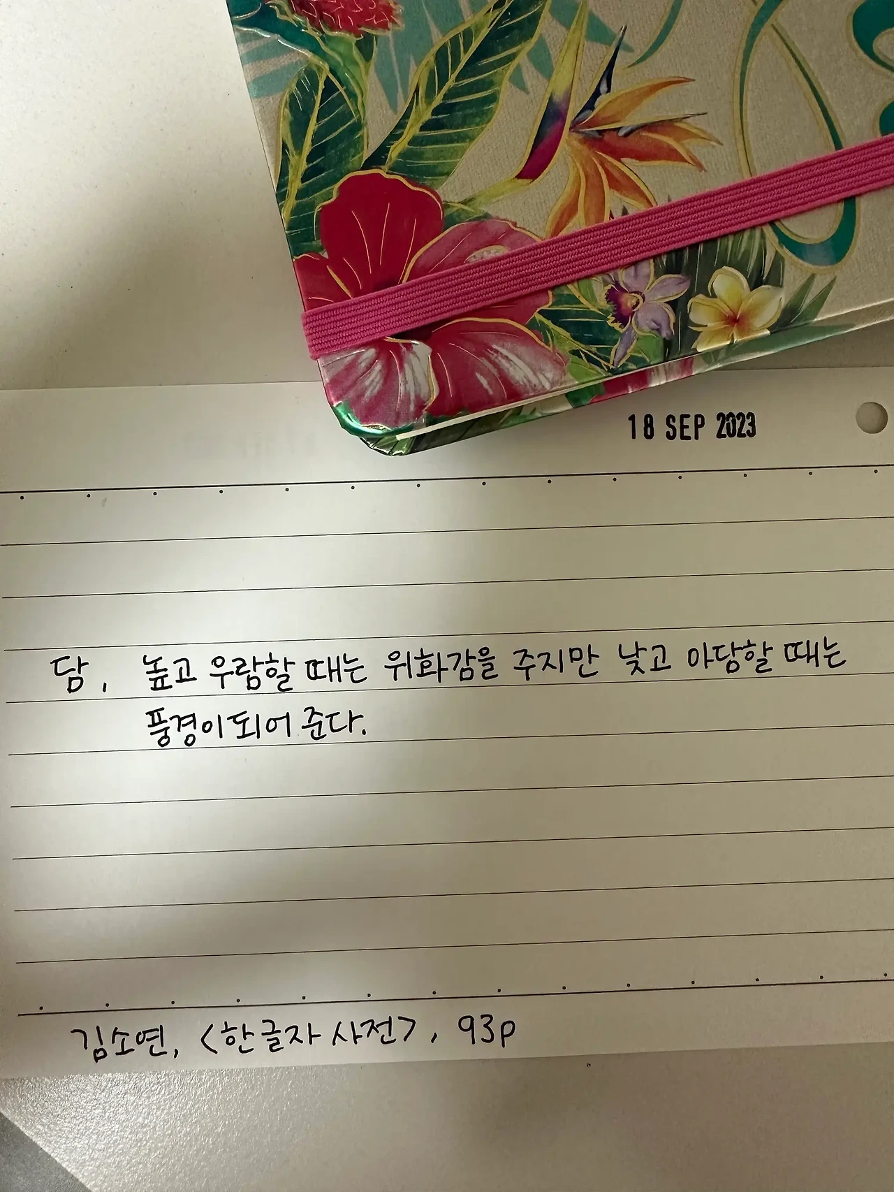 이 문장을 읽고 내 마음의 담에 대해 생각했다. cctv와 철사가 감긴 우람한 담을 치고 사는 건 아닌지. 제주도 돌담처럼 바람이 지나다니고 계절마다 꽃도 피는 마음의 담을 가진 사람이 되고 싶다.